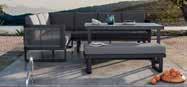 Lounge program Manhattan, aluminijska konstrukcija zaštićena praškastim premazom u antracit boji, uže od tekstilen tkanine. Kutna garnitura s blagovaonskim stolom, lijevi ili desni kut, sastav: kutna klupa, cca š/v/d: 93x85x93 cm, nosivosti do 120 kg; klupa, cca š/v/d: 126x85x93 cm, nosivosti do 240 kg; klupa, cca š/v/d: 186x85x93 cm, nosivosti do 360 kg; stol, cca š/v/d: 152x68x96 cm, nosivosti do 60 kg. Lounge fotelja, cca š/v/d: 56x85x69 cm, nosivosti do 120 kg. (06210006/03,09,01)