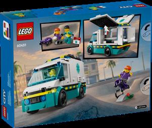 LEGO City 60451 vozilo hitne pomoći Jao! Djevojka je pala sa skateboarda i treba pomoć. Pridruži se bolničaru i pojurite do nje u kolima hitne pomoći. Digni bočne ploče i otvori stražnja vrata da dođeš do nosila i drugog medicinskog pribora.