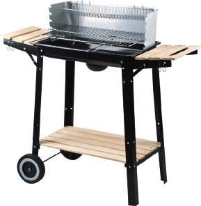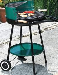 Roštilj Barbecue Garden dimenzije: 93 x 40 x 85 cm, rešetka: 53 x 32 cm, pet razina visine, posuda za pepeo, emajlirana plitica za pripremu vatre, kotači za lakši transport, drvena bočna polica s ručkom i kukom, podna polica za odlaganje, rešetka za grijanje hrane 1 kom