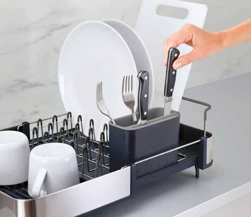 8: Ocjeđivač posuđa, metal/umjetna vlakna, boja: siva, razvlačno, 31x7x35 cm. Ocjeđivač posuđa, oplemenjeni čelik/polipropilenska vlakna, boja: siva, 39,5x32x12,5 cm. (49130501;35010161)