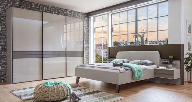 Spavaća soba Monza , boja: svetlosiva. Ram kreveta i 2 noćna ormarića , krevet s tapaciranim uzglavljem, izgled kože, dim. 189x218 cm, ležaj dim. 180x200 cm , 2x noćni ormarić dim. 60x48x43 cm. Letvice, dušek, rasveta uzglavlja i panel noćnih ormarića uz doplatu. Ormar s kliznim vratima stakleni front, 3-krilni, dim. 300x217x67 cm. Uz doplatu dostupan velik izbor elemenata kao: paspartu bez ili s rasvetom, police, rasveta polica, šipke, unutrašnje fioke, držači kravata, pantalona i obuće, lift šipka, klupa, komode i dr. Komoda, 5 fioka, dim. 80 x 86 x 43 cm (04420286/01-02,04)