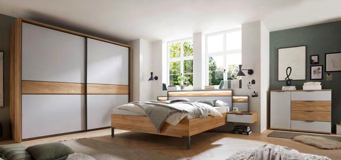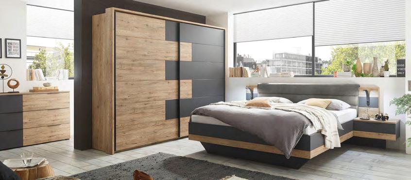 Spavaća soba Pesina, delimičan masiv hrasta, boja: hrast/grafitno siva/svetlosiva. Ormar s kliznim vratima, 2 vrata, 6 polica, 3 šipke, dim. 270 x 225,5 x 61,2 cm. Ram kreveta + noćni ormarići, sa LED rasvetom, ležaj dim. 180 x 200 cm. Komoda , dim. 120 x 96 x 38 cm Paspartu za ormar, letvice i dušek dostupni uz doplatu (12980059/01-03)