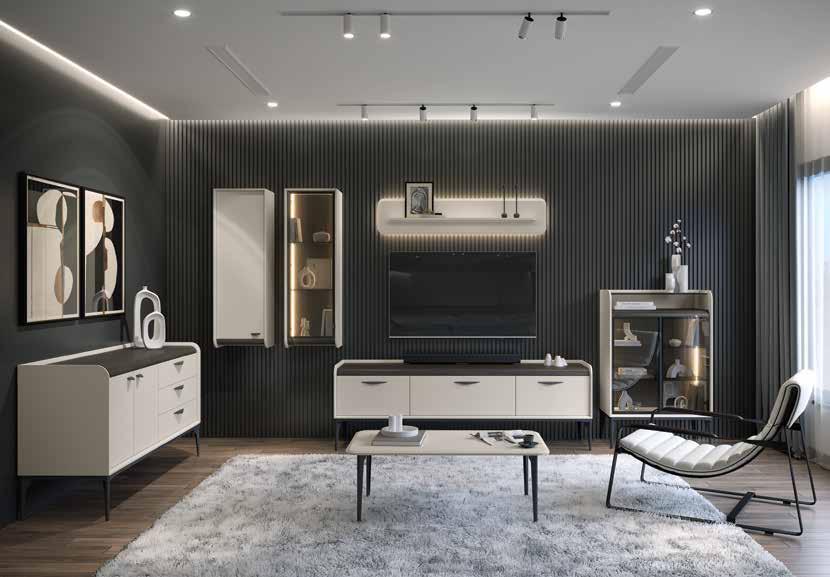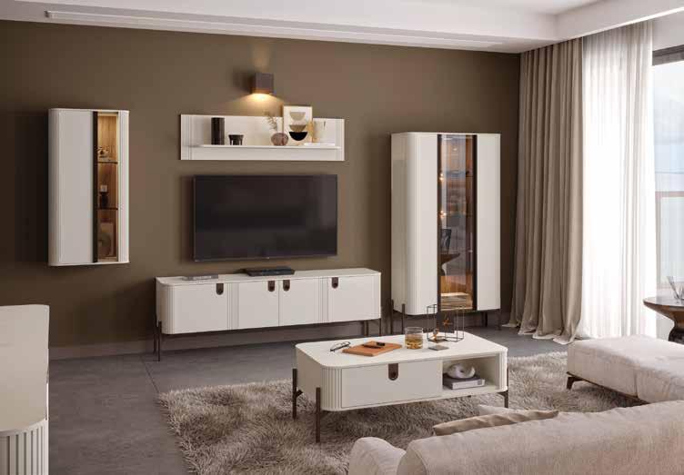Zaobljeni detalji glavna su karakteristika kolekcije Soffy. Oblina bočnih strana, zaobljeni plafon i forma metalne noge skladno su uklopljeni u svim elementima. Pored zaobljene forme ove kolekcije ima integrisanu LED rasvetu. Ova diskretna, ali efektna rasveta ne samo da naglašava elegantne linije nameštaja, već i dodatno ističe teksture i detalje. Topla boja svetlosti u staklenim elementima i na polici stvoriće prijatnu i intimnu atmosferu u vašem dnevnom boravku.