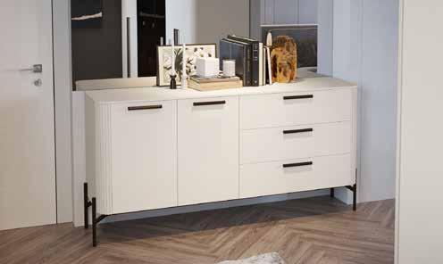 Komoda sa tri fioke i dva krila obogaćena je unutrašnjošću obloženom dekorom tekstila, dok soft-close mehanizam doprinosi vrhunskoj praktičnosti. Komoda ima dupli plafon kao i bočne strane, elegantne ručice, metalne nožice i ram koji pruža dodatnu stabilnost.