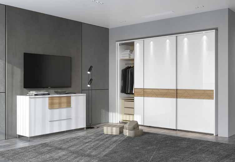 Standardna oprema ovih garderobera su police i plafon sa integrisanom rasvetom. Osim osnovne opreme, u ponudi su dodatni fahovi sa rasvetom, koji se mogu montirati i u sklopu plakara sa punim krilima. Pažljivo dizajniran krevet, tapaciran je prijatnim materijalom Alkantara u kombinaciji sa eko kožom. Alkantara je izuzetno popularan materijal zbog svojih karakteristika u odnosu na kožu, bolje prijanja prilikom dodira i leti hladi, a zimi je topla. Ova kombinacija će doprineti da vaša spavaća soba bude ušuškano i ugodno mesto stvoreno za odmor. Krevet, dostupan u dve širine, 160 i 180cm, udoban je i praktičan. On ima podizni mehanizam sa latofleks letvicama i kutiju za posteljinu i odlaganje stvari.