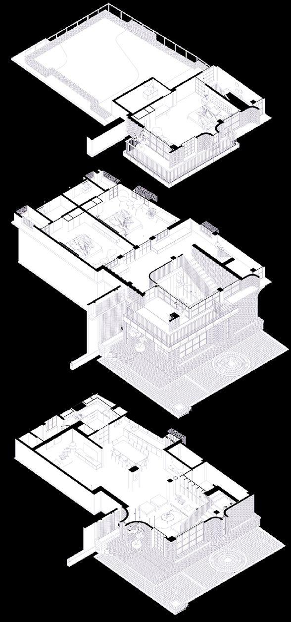 Site Location 0’ 100’ On Site Situation Complete Axonometric View Ground Floor 3. Dining 2. Family Living 1. Living Room 0. Entry 4. Kitchen 5. Service zone 6. Service Toilet 7. Toilet 9. Varanda 10. Corridor 11. Bedroom 12. Small Pantry 13. Roof Terrace 8. Storage + Drivers’ Accomodation 1st Floor 1 0 2 3 4 5 7 8 9 9 10 12 11 11 11 7 7 13 7 6 2nd Floor