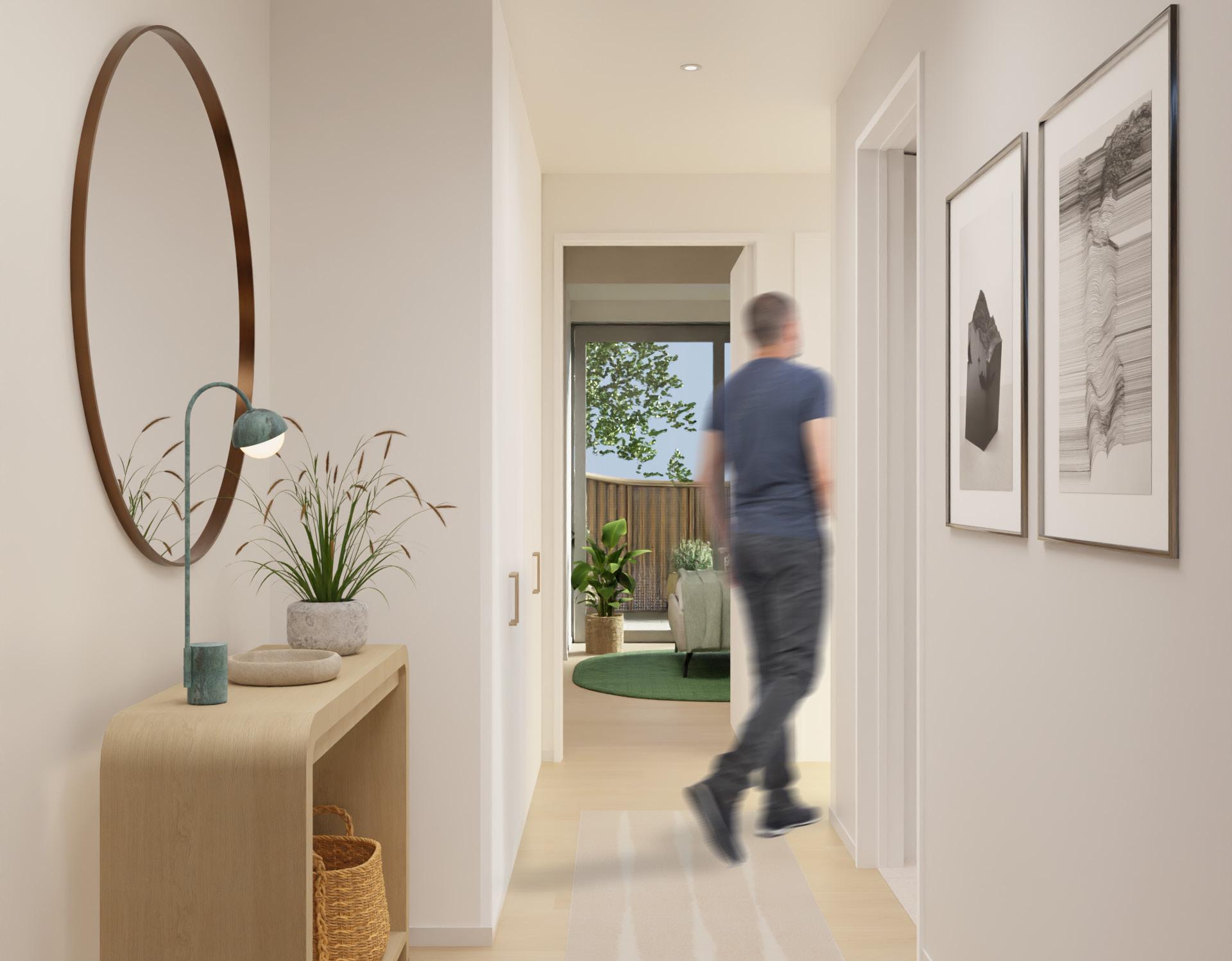 Entry hallways include a hanging closet and wall space for a bench, credenza or simple wall hooks to hold your keys or take off your shows.