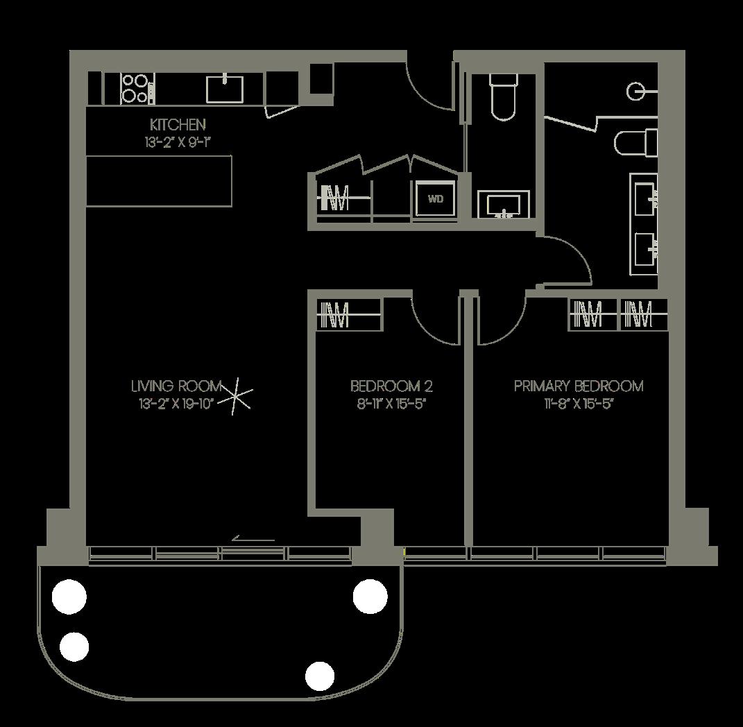 Thanks to its double exposure, the Two Bedroom Corner is awash with daylight throughout the home. A foyer with ample closets, and full bathroom leads into a spacious open living space. The high performance kitchen includes a peninsula with bar seating.