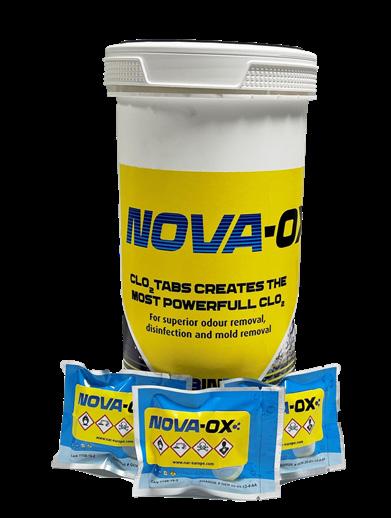 NOVA-OX er ny teknologi, hvor du selv producerer en højpotent klordioxid-væske ved hjælp af hurtigt opløsende tabs, i den koncentration som er nødvendig for det pågældende job. NOVA-OX kan bruges særskilt til desinfektion, lugtsanering m.v., men i forening med EASY-OX gas udgør det skadeservicebranchens hurtigste og mest potente lugtneutraliseringssystem ved lette, medium og især ved meget svære lugtsaneringsopgaver. Læs mere om NOVA-OX i særskilt brochure. Du kan også producere ClO2 gas ved hjælp af NOVA-OX