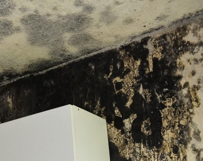 Wallpapered surfaces with mould growth on the back of the wallpaper and/or on the substrate.
