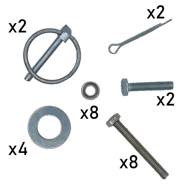 8 x M6 skruer (50 mm), 2 x M6 skruer (30 mm), 2 sikkerhedssplinter, 8 skiver á 6,4 mm, 4 skiver á 15,5 mm, 2 sikkerhedsstifter.