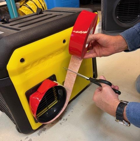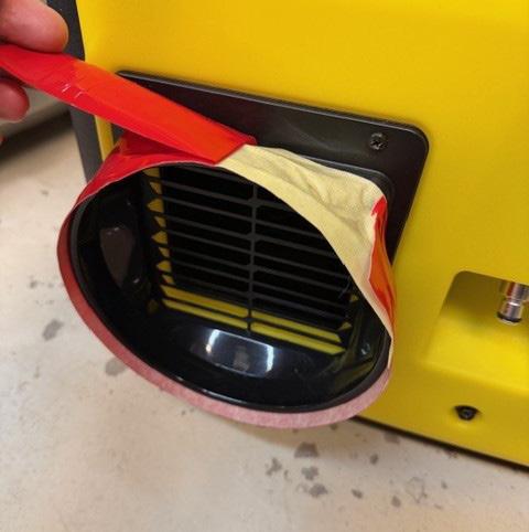 Billede 6: Klip rød tape over med en saks eller hobbykniv. Tryk let på tapen hele vejen rundt om luftudtaget for optimal vedhæftning.