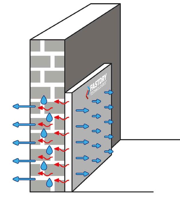 Principskitse af vægtørremodulet oprindeligt kaldet EDF og senere »FastDry Technology« og nu DryPanel PRO. Det diffusionsåbne modul med termisk isoleret overfladevarme på rumsiden placeres formsluttende på væggen for at opvarme hele overfladen på en kontrolleret måde.
