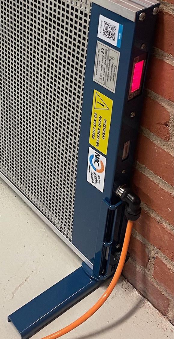 En indbygget temperatursensor tilfører panelet en automatisk tænd og sluk funktion under tørreprocessen. Hvis temperaturen indstilles til de anbefalede 70°C, bruges der strøm indtil denne temperatur er opnået og apparatet slukker derefter. Hvis temperaturen falder til under 70°C tænder apparatet igen, så den indstillede værdi bevares. Den anbefalede tørretemperatur indstilles på et LCD-display på siden af panelet, og vi anbefaler at sætte temperaturen på 70°C på en opfugtet standard beton/murstensvæg/ pudset væg m.v.