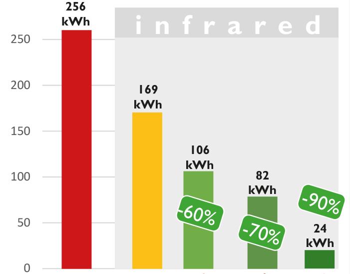 DryPanel PRO varmepaneler er ekstremt energieffektive, fordi de opvarmer væggen, men ikke rummet. Da DryPanel PRO har indbygget temperaturstyring og lader fugt uhindret passere gennem den diffusionsåbne overflade, har et DryPanel PRO varmepanel brugt 75% mindre energi efter et vellykket tørringsforløb i forhold til konventionelle/kommercielle IR-Paneler, ikke WMT DryPanels. Sammenlignet med vægtørring ved brug af folietelt og sorptionsaffugter er værdierne endnu mere imponerende: Energiforbruget ved Folietelts-tørring er mere end 10 gange større! Denne energieffektivitet er blevet bekræftet i praksis efter 6 måneders brug og er blevet bevist i tests udført af Fraunhofer Institute for Building Physics (IBP Stuttgart).