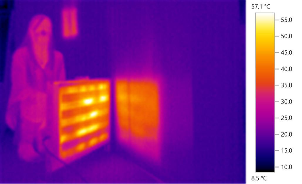 Fuktigheten fra veggen slipper ut i form av vanndamp gjennom modulen og inn i rommet, og etter oppvarmingsfasen også gjennom baksiden av veggen.
