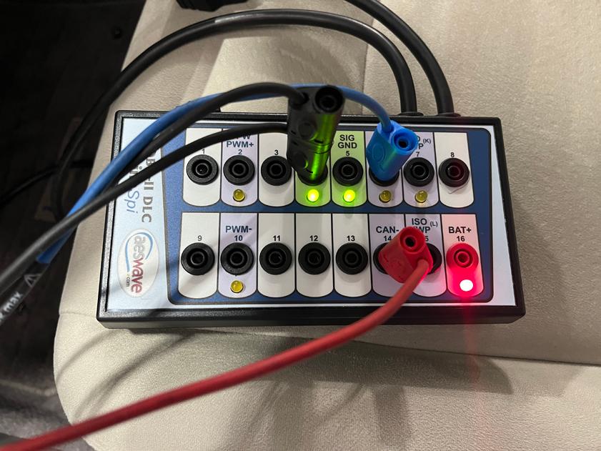 The Nissan Leaf, like most other electric vehicles, uses the standard J1962 data link connector. The diagnostics we performed were through a breakout box that was connected to that connector. I strongly suggest the use of a breakout box, not only for the ease of connection, but more importantly, to preserve the integrity of the data link connector pins. Additionally, we used a high-speed, high-capacity oscilloscope and a class III rated multimeter. We did not use any insulated tools or high voltage gloves because none of our testing was conducted on a high voltage cable or component.