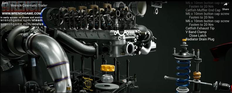 Wrench - Motorsports Mechanic Simulator. While it was released a couple of years ago, Wrench is available as an early release on a traditional desktop mouse/keyboard set up or as virtual reality for Oculus. A game designed as a mechanic simulator, players begin by opening their own shop and taking on customer cars so that they may prepare and maintain race cars. Users must also problem solve to diagnose and correct problems with the virtual vehicles while successfully operating their shop. The parts in Wrench are extremely detailed and great attention was paid to each component, including fasteners which are accurate to the thread pitch and install torque.