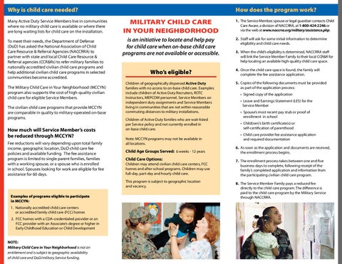 Why is child care needed? Many Active Duty Service Members live in communities where no military child care is available or where there are long waiting lists for child care on the installation. To meet their needs, the Department of Defense (DoD) has asked the National Association of Child Care Resource & Referral Agencies (NACCRRA) to partner with state and local Child Care Resource & Referral agencies (CCR&Rs) to refer military families to nationally accredited civilian child care programs and help additional civilian child care programs in selected communities become accredited. The Military Child Care in Your Neighborhood (MCCYN) program also supports the cost of high-quality civilian child care for eligible Service Members. The civilian child care programs that provide MCCYN are comparable in quality to military-operated on-base programs.