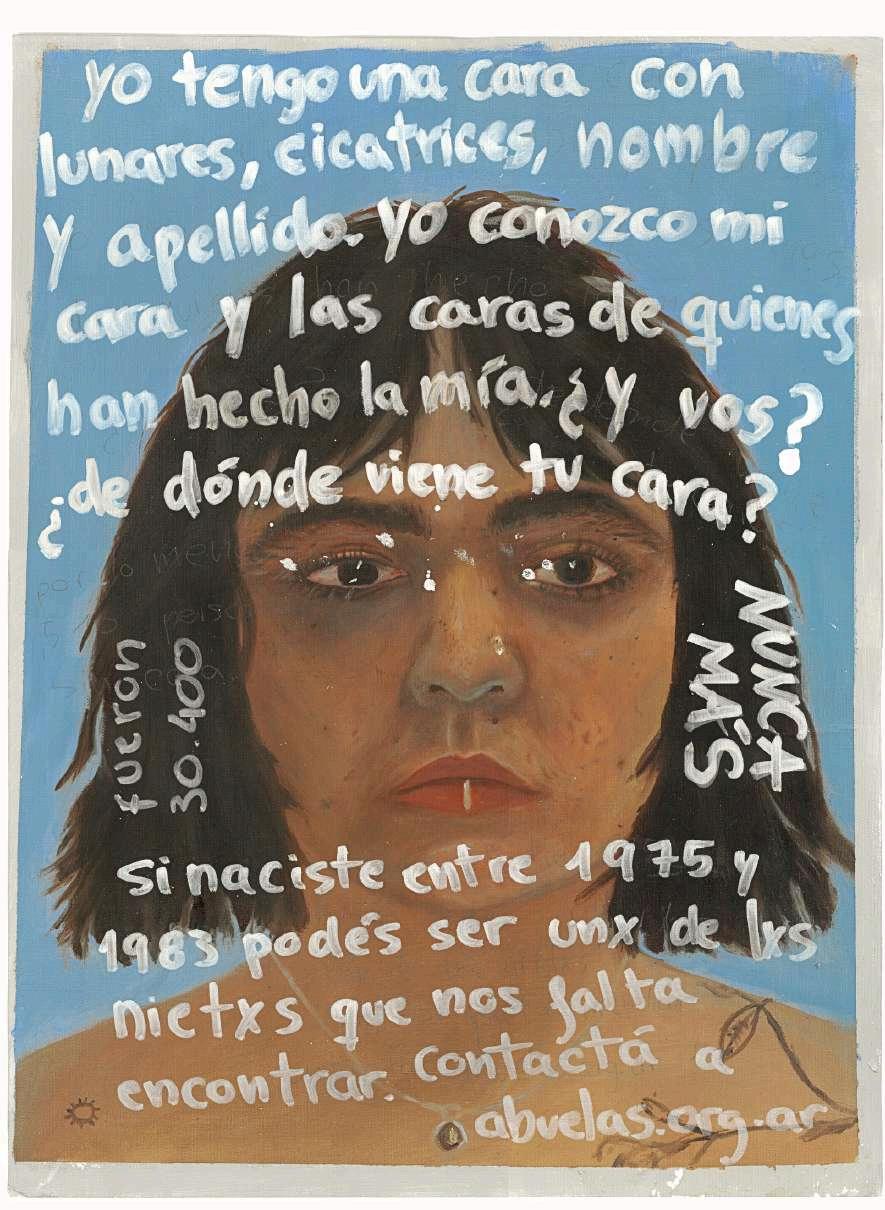 I grew up with stories about Luis, my uncle, who never saw the faces of those he loved again after he,hiswifeandhisnewborndisappearedduringthe military dictatorship that plagued Argentina from 1976 until 1983. I grew up hearing my grandmother Pilar ask us if we believed Luis would ever return Like my uncle, pregnant women and children were disappeared. Many of these children were born in captivity due to detainment, instantly appropriated, and raised with false identities. To date, there are more than 500 missing children, now full-grown adults who do not know where their bodies came from, or who to attribute their history to. More than 30,000wereabductedanddisappearedunderstate terrorism Theirbodiesarestillnowheretobefound Si naciste entre 1975 y 1983 en Argentina, podés ser unx de lxs nietxs que seguimos buscando. Si dudásdetuidentidad,contactáaAbuelasorgar Iknowmyface.Iknowmybody.Doyou?