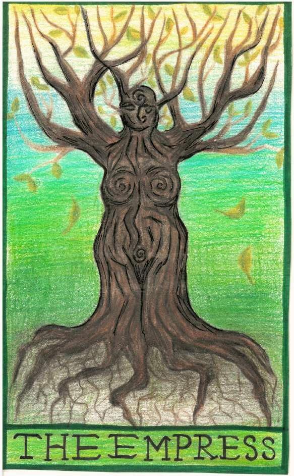 This drawing is my own rendition of the third major arcana Tarot card, The Empress, which symbolizes the divine feminine qualities within all of us. The Empress is an embodiment of creative, nurturing, compassionate, life supporting energy I drew The Empress as a tree, because whenIamspendingtimeinnatureIfeelthemostintunewith my energy, as well as that of every other being. We are all connectedandinterdependentoneachother Noonebody –human body, animal body, plant body, water body, energy body,etc–isasindividualaswemayperceiveittobe. ThebodyofatreespeakstothetruthofTheEmpresscard, becauseofhowtreesconnectthroughtheirrootsandprovide nutrients to other plants and organisms in the soil. Trees are notindividualbeings,andthelifeofaforest,anecosystem,is dependent on their networked community I also love how trees show us that they can only grow as tall as the roots burrow deep. The deeper we connect to our true self, which is in fact not a completely individual "self" at all, the more alignedwearewithpurpose,inspiration,andcommunity,and the more we can create a life of our choosing. Our roots penetrate the shadows of our ancestral lineage, childhoods, and unconscious energy, asking for our acknowledgement andcompassionsothatwemaystrengthenourtrunks,reach ourbrancheshigherabove,andbloominvibrantgrowth This means that the parts of ourselves we deem most ugly and unwanted deserve to be embraced with love, and this embrace is necessary for true growth We are all The Empress,andweareallthebodyofatree.