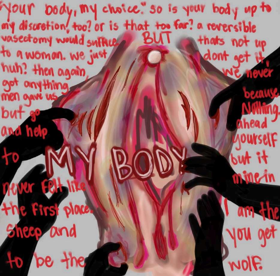 I felt particularly compelled to create this piece because, following Donald Trump’s reelection, Nick Fuentes posted a video online that included the phrase “your body, my choice.” This was followed by other heinous and disgusting phrases Including the outburst of excitement for Trump’s presidency and plans for the next four years, which go against the comfort and safety of marginalized groups. This issue drives deep within those communities, but speaks deafeningly to me as someone who has experienced other forms of disrespect regarding the rights to my body. For every other person who has faced assault, general bodily fears, and surrounding issues, you are loved. Art is only one way to express grievances and pain and I hope the message makes you feel heard. Your issues matter.