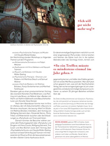 «So ein Treffen müsste es mindestens einmal im Jahr geben.» gegenseitig kennen und ließen das Erlebte gemeinsam ein erstes Mal Revue passieren. Man darf jetzt schon gespannt sein, was sich der Nachtschatten Verlag, dem es hervorragend gelungen ist, ein unvergessliches und absolut einmaliges Symposium zu initiieren, zu seinem 35-jährigen Bestehen einfallen lässt. Die Zitate sind Besucherstimmen zum Symposium. Psychonauten, die nicht persönlich am Symposium teilnehmen konnten, dürfen sich auf eine Sammlung von Mitschnitten der Vorträge und Podien zusammen mit weiteren Highlights freuen. Sie ist ab jetzt in Form eines DVD-Doppelalbums beim Nachtschatten Verlag erhältlich. Einzelne Vorträge werden auch auf dem Kanal der Nachtschatten Television ausgestrahlt (www.nachtschatten-television.ch).