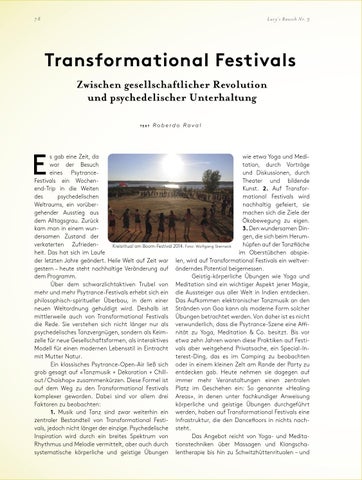 s gab eine Zeit, da wie etwa Yoga und Medi war der Besuch tation, durch Vorträge eines Psytranceund Diskussionen, durch Festivals ein WochenTheater und bildende end-Trip in die Weiten Kunst. 2. Auf Transfor des psychedelischen mational Festivals wird Weltraums, ein vorübernachhaltig gefeiert, sie gehender Ausstieg aus machen sich die Ziele der dem Alltagsgrau. Zurück Ökobewegung zu eigen. kam man in einem wun3. Den wundersamen Dindersamen Zustand der gen, die sich beim Herumverkaterten Zufriedenhüpfen auf der Tanzfläche Kreisritual am Boom-Festival 2014. Foto: Wolfgang Sterneck heit. Das hat sich im Laufe im Ober stübchen abspieder letzten Jahre geändert. Heile Welt auf Zeit war len, wird auf Transformational Festivals ein weltvergestern – heute steht nachhaltige Veränderung auf änderndes Potential beigemessen. dem Programm. Geistig-körperliche Übungen wie Yoga und Über dem schwarzlichtaktiven Trubel von Meditation sind ein wichtiger Aspekt jener Magie, mehr und mehr Psytrance-Festivals erhebt sich ein die Aussteiger aus aller Welt in Indien entdecken. philosophisch-spiritueller Überbau, in dem einer Das Aufkommen elektronischer Tanzmusik an den neuen Weltordnung gehuldigt wird. Deshalb ist Stränden von Goa kann als moderne Form solcher mittlerweile auch von Transformational Festivals Übungen betrachtet werden. Von daher ist es nicht die Rede. Sie verstehen sich nicht länger nur als verwunderlich, dass die Psytrance-Szene eine Affipsychedelisches Tanzvergnügen, sondern als Keim- nität zu Yoga, Meditation & Co. besitzt. Bis vor zelle für neue Gesellschaftsformen, als interaktives etwa zehn Jahren waren diese Praktiken auf FestiModell für einen modernen Lebensstil in Eintracht vals aber weitgehend Privatsache, ein Special-Inmit Mutter Natur. terest-Ding, das es im Camping zu beobachten Ein klassisches Psytrance-Open-Air ließ sich oder in einem kleinen Zelt am Rande der Party zu grob gesagt auf «Tanzmusik + Dekoration + Chill entdecken gab. Heute nehmen sie dagegen auf out / Chaishop» zusammenkürzen. Diese Formel ist immer mehr Veranstaltungen einen zentralen auf dem Weg zu den Transformational Festivals Platz im Geschehen ein: So genannte «Healing komplexer geworden. Dabei sind vor allem drei Areas», in denen unter fachkundiger Anweisung Faktoren zu beobachten: körperliche und geistige Übungen durchgeführt 1. Musik und Tanz sind zwar weiterhin ein werden, haben auf Transformational Festivals eine zentraler Bestandteil von Transformational Festi- Infrastruktur, die den Dancefloors in nichts nachvals, jedoch nicht länger der einzige. Psychedelische steht. Inspiration wird durch ein breites Spektrum von Das Angebot reicht von Yoga- und Medita Rhythmus und Melodie vermittelt, aber auch durch tionstechniken über Massagen und Klangschasystematische körperliche und geistige Übungen lentherapie bis hin zu Schwitzhüttenritualen – und