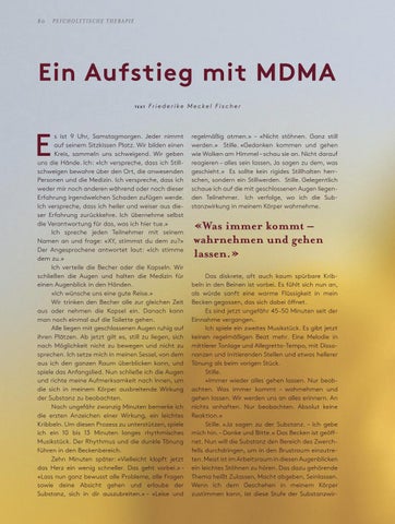 s ist 9 Uhr, Samstagmorgen. Jeder nimmt auf seinem Sitzkissen Platz. Wir bilden einen Kreis, sammeln uns schweigend. Wir geben uns die Hände. Ich: «Ich verspreche, dass ich Still schweigen bewahre über den Ort, die anwesenden Personen und die Medizin. Ich verspreche, dass ich weder mir noch anderen während oder nach dieser Erfahrung irgendwelchen Schaden zufügen werde. Ich verspreche, dass ich heiler und weiser aus die ser Erfahrung zurückkehre. Ich übernehme selbst die Verantwortung für das, was ich hier tue.» Ich spreche jeden Teilnehmer mit seinem Namen an und frage: «XY, stimmst du dem zu?» Der Angesprochene antwortet laut: «Ich stimme dem zu.» Ich verteile die Becher oder die Kapseln. Wir schließen die Augen und halten die Medizin für einen Augenblick in den Händen. «Ich wünsche uns eine gute Reise.» Wir trinken den Becher alle zur gleichen Zeit aus oder nehmen die Kapsel ein. Danach kann man noch einmal auf die Toilette gehen. Alle liegen mit geschlossenen Augen ruhig auf ihren Plätzen. Ab jetzt gilt es, still zu liegen, sich nach Möglichkeit nicht zu bewegen und nicht zu sprechen. Ich setze mich in meinen Sessel, von dem aus ich den ganzen Raum überblicken kann, und spiele das Anfangslied. Nun schließe ich die Augen und richte meine Aufmerksamkeit nach Innen, um die sich in meinem Körper ausbreitende Wirkung der Substanz zu beobachten. Nach ungefähr zwanzig Minuten bemerke ich die ersten Anzeichen einer Wirkung, ein leichtes Kribbeln. Um diesen Prozess zu unterstützen, spiele ich ein 10 bis 13 Minuten langes rhythmisches Musikstück. Der Rhythmus und die dunkle Tönung führen in den Beckenbereich. Zehn Minuten später: «Vielleicht klopft jetzt das Herz ein wenig schneller. Das geht vorbei.» – «Lass nun ganz bewusst alle Probleme, alle Fragen sowie deine Absicht gehen und erlaube der Sub stanz, sich in dir auszubreiten.» – «Leise und