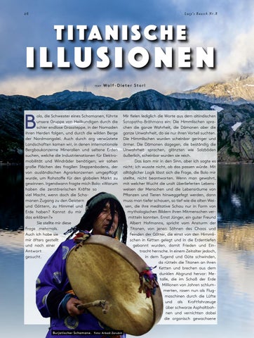 olo, die Schwester eines Schamanen, führte unsere Gruppe von Heilkundigen durch die schier endlose Grassteppe, in der Nomaden ihren Herden folgen, und durch die wilden Berge der Nordmongolei. Auch durch arg verwüstete Landschaften kamen wir, in denen internationale Bergbaukonzerne Mineralien und seltene Erden suchen, welche die Industrienationen für Elektromobilität und Windräder benötigen; wir sahen große Flächen des fragilen Steppenbodens, der von ausländischen Agrarkonzernen umgepflügt wurde, um Rohstoffe für den globalen Markt zu gewinnen. Irgendwann fragte mich Bolo: «Warum haben die zerstörerischen Kräfte so viel Macht, wenn doch die Schamanen Zugang zu den Geistern und Göttern, zu Himmel und Erde haben? Kannst du mir das erklären?» Sie stellte mir diese Frage mehrmals. Auch ich habe sie mir öfters gestellt und nach einer Antwort gesucht.
