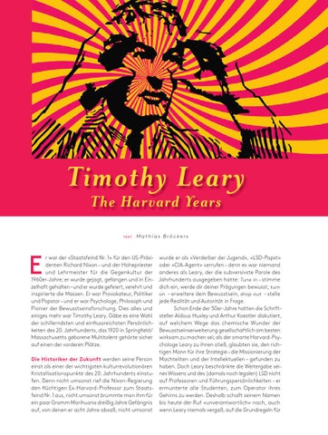 r war der «Staatsfeind Nr. 1» für den US-Präsi- wurde er als «Verderber der Jugend», «LSD-Papst» denten Richard Nixon – und der Hohepriester oder «CIA-Agent» verrufen – denn es war niemand und Lehrmeister für die Gegenkultur der anderes als Leary, der die subversivste Parole des 1960er-Jahre; er wurde gejagt, gefangen und in Ein- Jahrhunderts ausgegeben hatte: Tune in – stimme zelhaft gehalten – und er wurde gefeiert, verehrt und dich ein, werde dir deiner Prägungen bewusst, turn inspirierte die Massen. Er war Provokateur, Politiker on – erweitere dein Bewusstsein, drop out – stelle und Popstar – und er war Psychologe, Philosoph und jede Realität und Autorität in Frage. Pionier der Bewusstseinsforschung. Dies alles und Schon Ende der 50er-Jahre hatten die Schrifteiniges mehr war Timothy Leary. Gäbe es eine Wahl steller Aldous Huxley und Arthur Koestler diskutiert, der schillerndsten und einflussreichsten Persönlich- auf welchem Wege das chemische Wunder der keiten des 20. Jahrhunderts, das 1920 in Springfield/ Bewusstseinserweiterung gesellschaftlich am besten Massachusetts geborene Multitalent gehörte sicher wirksam zu machen sei; als der smarte Harvard-Psychologe Leary zu ihnen stieß, glaubten sie, den richauf einen der vorderen Plätze. tigen Mann für ihre Strategie – die Missionierung der Die Historiker der Zukunft werden seine Person Machteliten und der Intellektuellen – gefunden zu einst als einer der wichtigsten kulturrevolutionären haben. Doch Leary beschränkte die Weitergabe seiKristallisationspunkte des 20. Jahrhunderts einstu- nes Wissens und des (damals noch legalen) LSD nicht fen. Denn nicht umsonst rief die Nixon-Regierung auf Professoren und Führungspersönlichkeiten – er den flüchtigen Ex-Harvard-Professor zum Staats- ermunterte alle Studenten, zum Operator ihres feind Nr. 1 aus, nicht umsonst brummte man ihm für Gehirns zu werden. Deshalb schallt seinem Namen ein paar Gramm Marihuana dreißig Jahre Gefängnis bis heute der Ruf «unverantwortlich» nach, auch auf, von denen er acht Jahre absaß, nicht umsonst wenn Leary niemals vergaß, auf die Grundregeln für