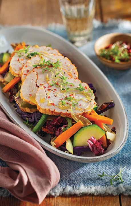 A la hora de servir, colocar en la base todas las hortalizas y la achicoria. Luego poner las pechugas cortadas previamente en rodajas y espolvorear con pimienta rosa para terminar.