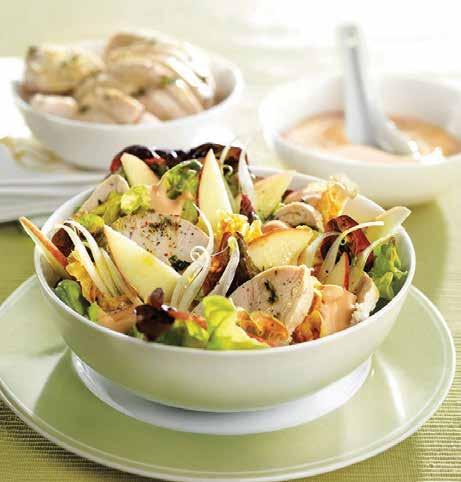 Mezcla la lechuga con la cebolleta, la pechuga la manzana. Condimenta todo con la salsa y sírvela.