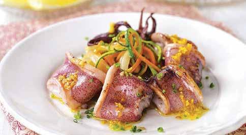 córtalas en juliana fina. Pela la cebolla y córtala de igual modo. A continuación, lava y seca el limón y la naranja. Ralla las cáscaras y exprímelos. Pon en un cuenco las ralladuras y los zumos con el sésamo, dos cucharadas de aceite, sal y pimienta y remueve. Limpia los calamares, lávalos, córtalos en anillos gruesos y salpimiéntalos. Saltéalos en una sartén 5 minutos y retíralos. Añade un poco más de aceite y saltea la cebolla un minuto.