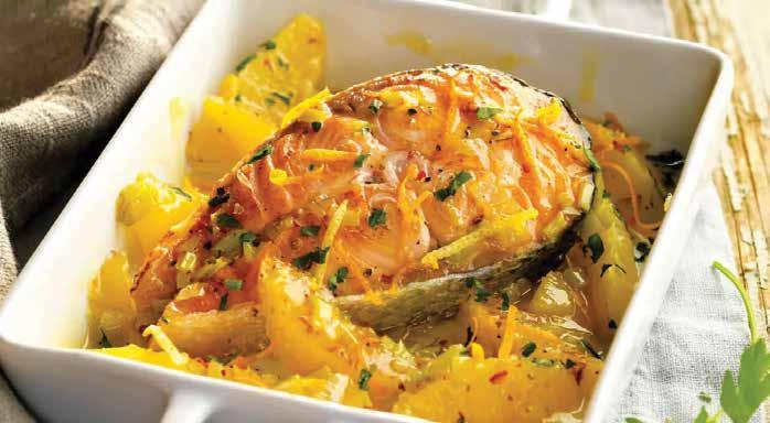 ■ Pon el salmón en una fuente refractaria, añade las naranjas con sus jugos de maceración y hornea unos 5 minutos, hasta que el salmón esté en su punto.