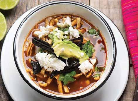 Para servir, coloca en cada plato un poco de queso, aguacate, y tiras de tortilla crujiente. Vierte la sopa caliente y adorna con una cucharada de crema y hojas de cilantro.
