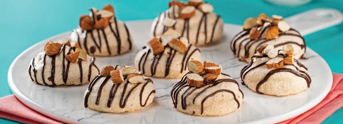 el edulcorante poco a poco hasta que las claras esponjen y cambien a color blanco, agrega las almendras que picaste de forma envolvente para evitar que se bajen las claras. Coloca en una manga y forma los merengues sobre una charola con papel encerado. Hornea a 100°C por 2 horas aproximadamente. Enfría. Decora con almendras y chocolate. Disfruta.