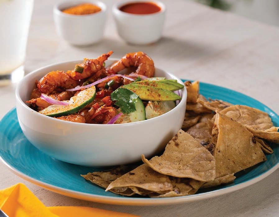 1 taza de jitomate, en cubos pequeños cebolla morada al gusto, en tiras delgadas, para decorar hoja de cilantro al gusto, para decorar pepino al gusto, en rebanadas aguacate al gusto, en rebanadas, para decorar totopos al gusto