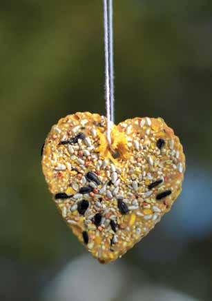 An ideal gift for any bird lover, this heart-shaped ornament is a delicious treat for feathered friends. Following the directions on the packaging, dissolve two packets of gelatin in hot water. Add oneand-a-half cups of birdseed to the gelatin and stir thoroughly. Place parchment paper and heart-shaped cookie cutters on a baking sheet. Pour the birdseed mixture into the molds and press down. Place a piece of straw near the top of the mold to create a hole for the string. Put the baking sheet with the ornaments in the refrigerator for 24 hours. After the ornaments have fully hardened, remove the straw and thread a piece of twine through the hole, tying it so the ornaments can be hung outside for birds to enjoy.