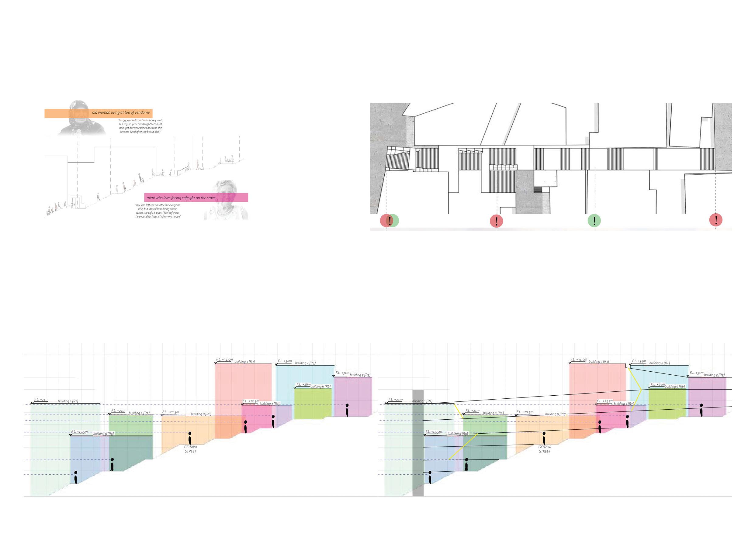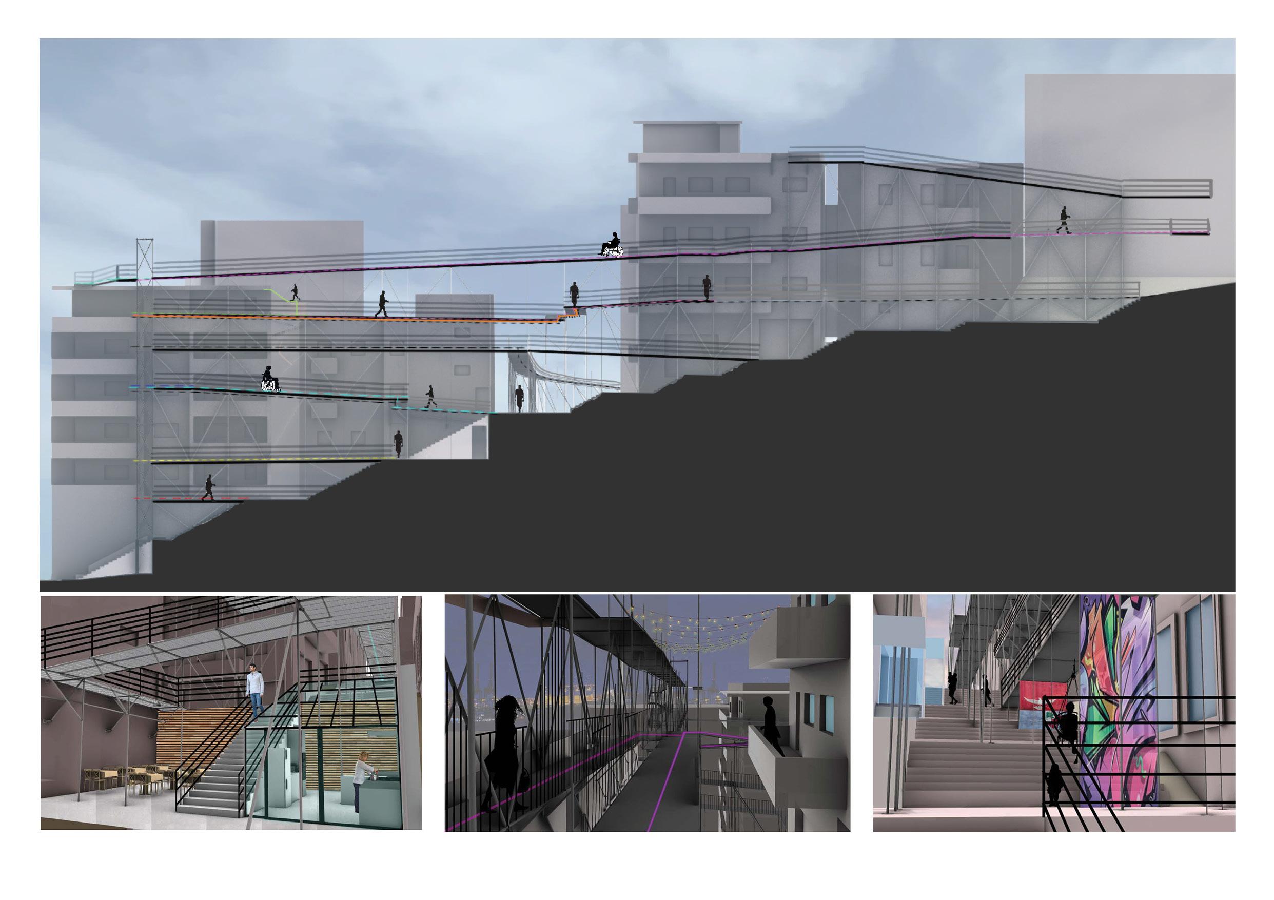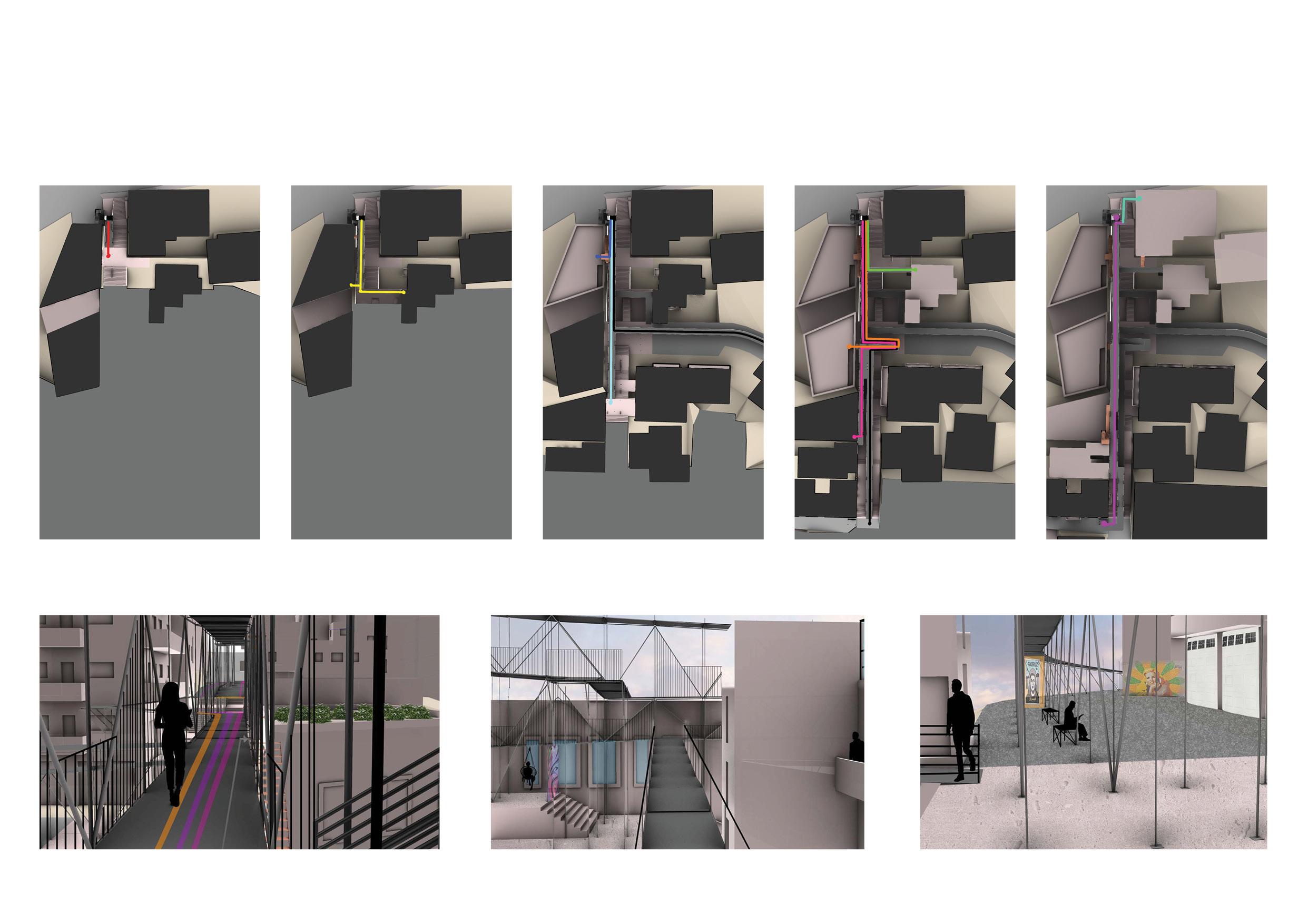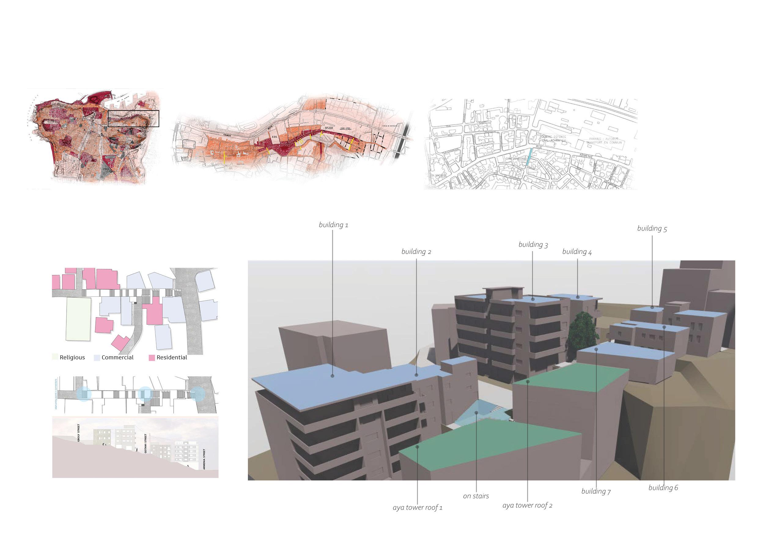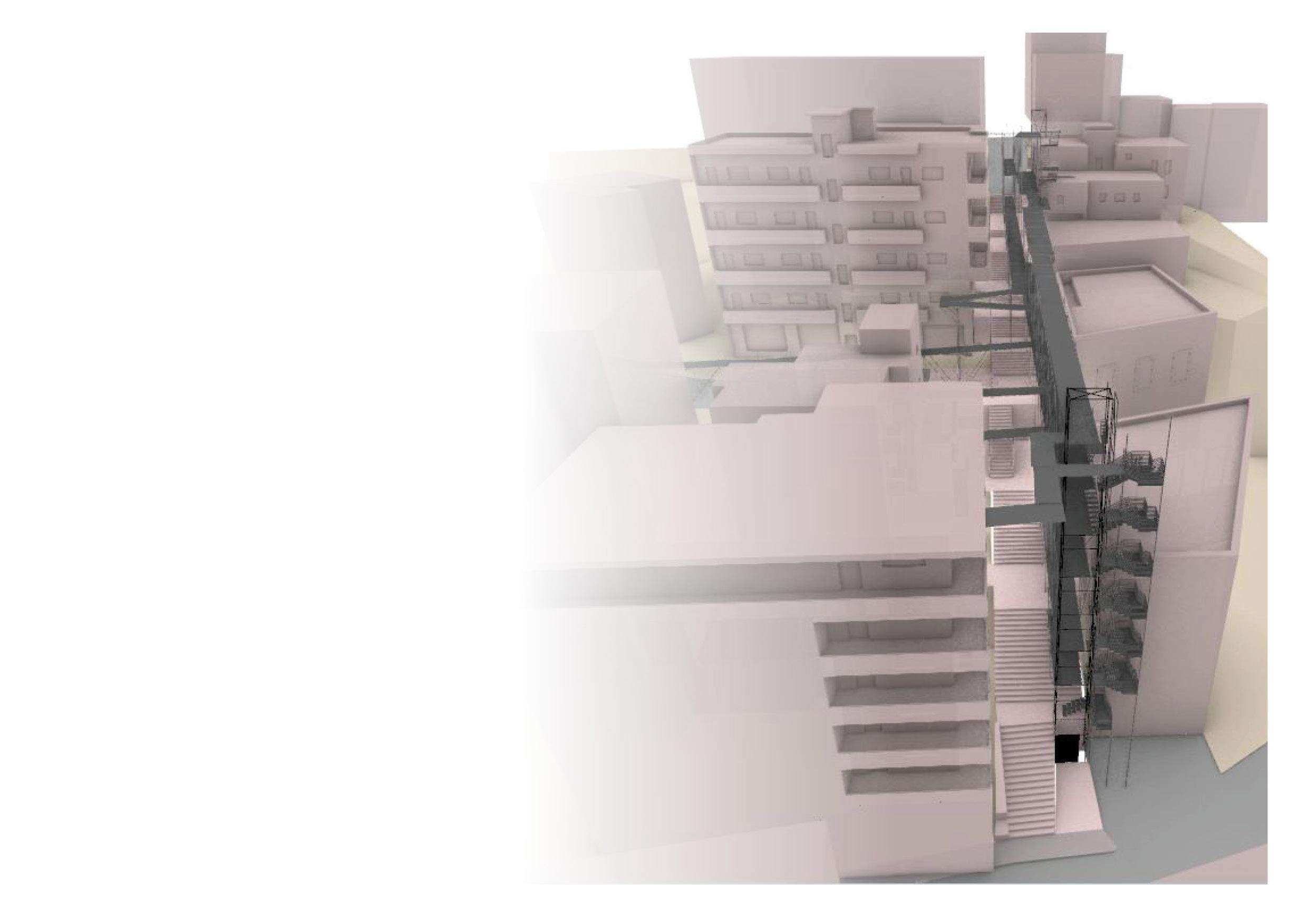 The establishment of a 3x3m grid was crucial in understanding the space. It allowed for the definition of a language between the stairs’ landings, the buildings’ rooftops, and the field of the vision of pedestrains on each landing. The intervention aims at uninterrupting pedestrains’ and residents’ views. Moreover, residents would benefit from the accessibility features of the intervention. The staircase would morph into a more lively area, and given the current economic situation of Lebanon, the residents would have the opportunity to put their rooftops to better, financially-generating uses. This allows the introduction of sub-urban cultivation in the city of Gemmayze.