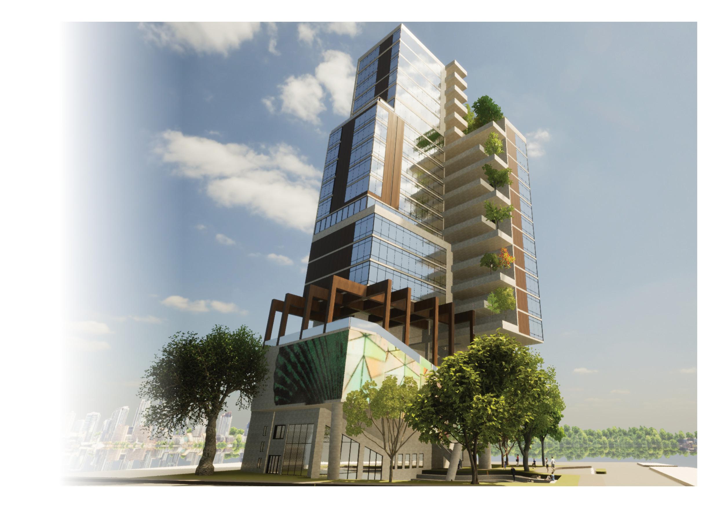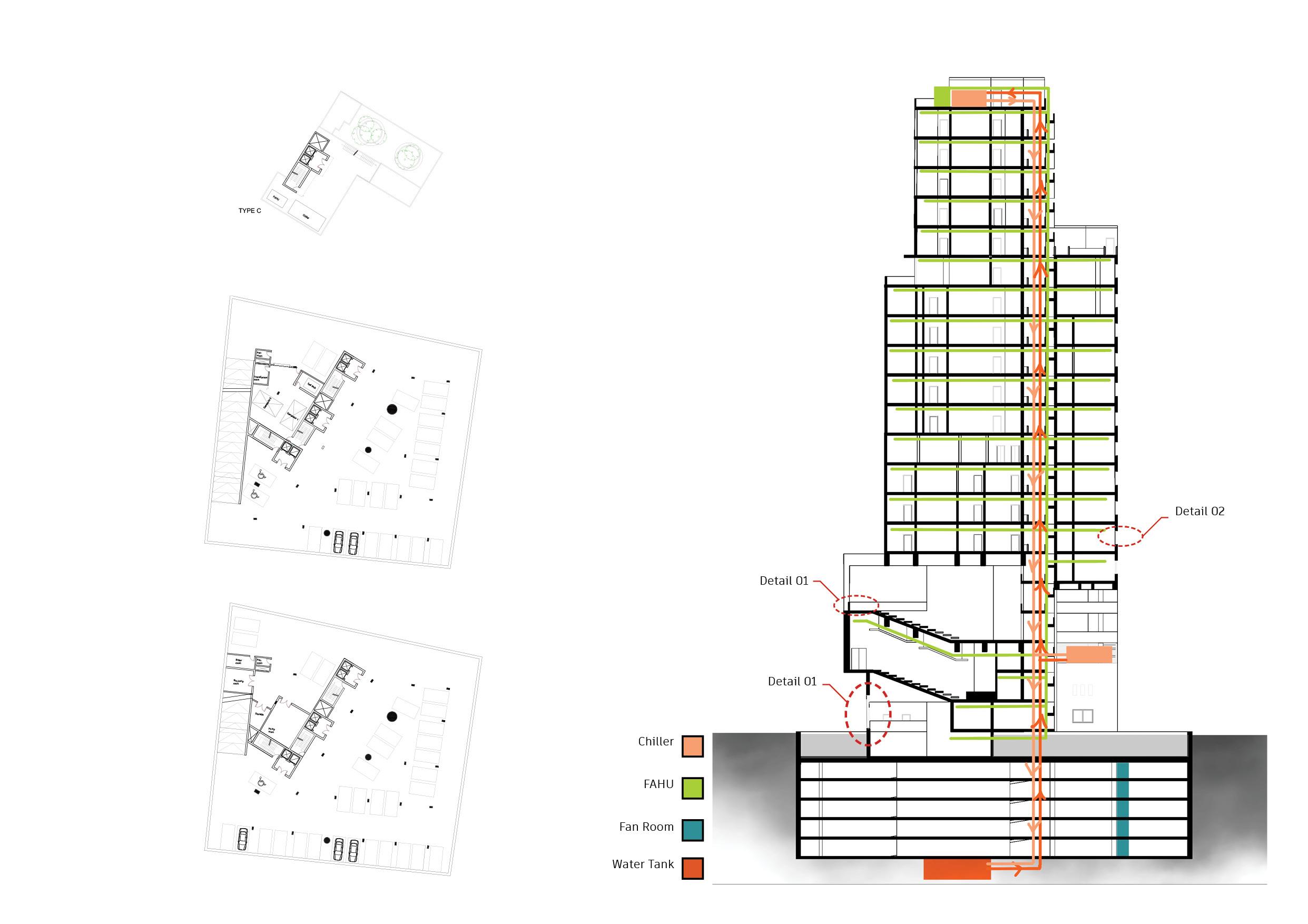 Orientation of the massing on the site optimizes views, limits sun exposure through self-shading, and the allocation of cores to absorb heat from western sun makes the building efficient with heat loss.