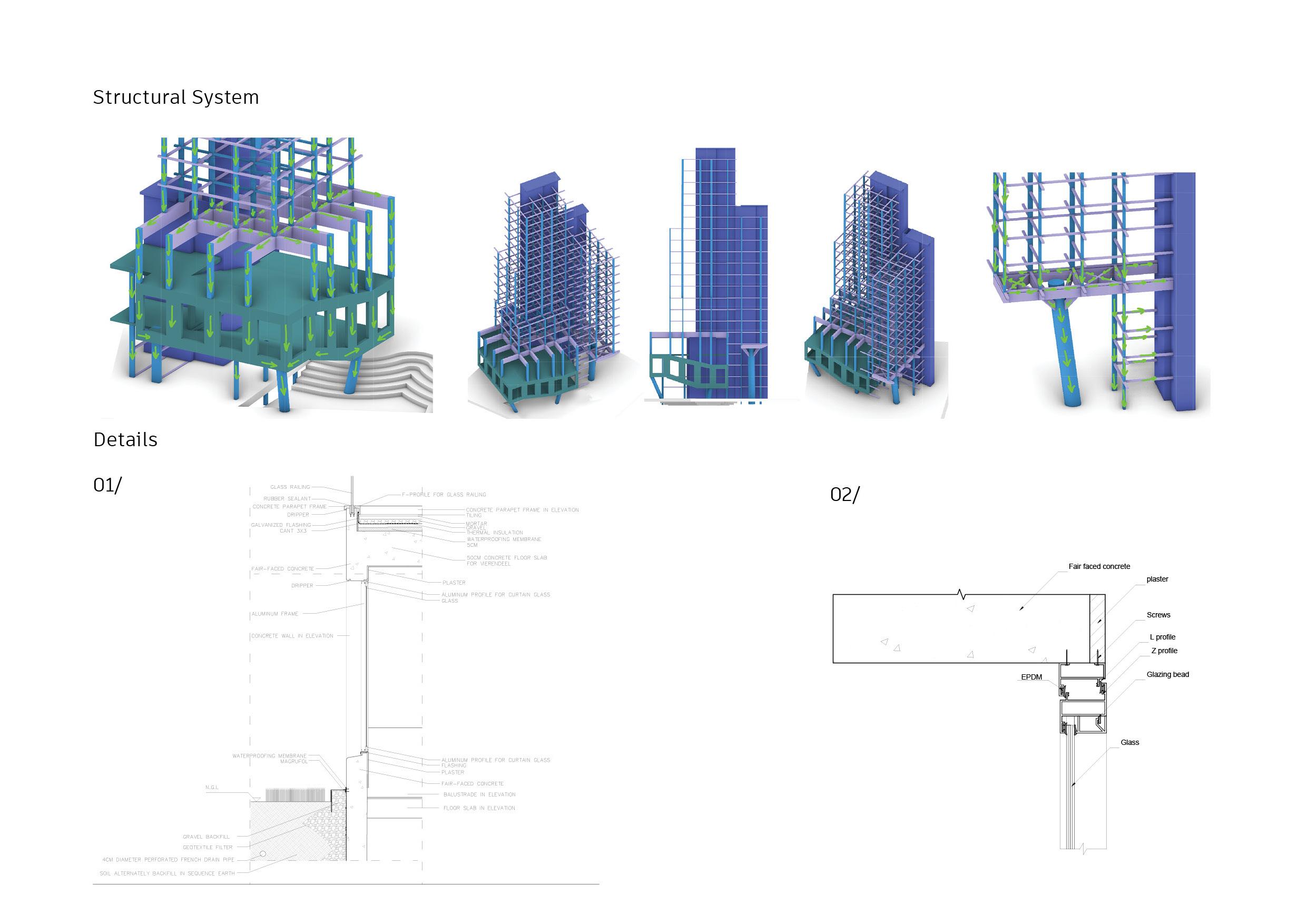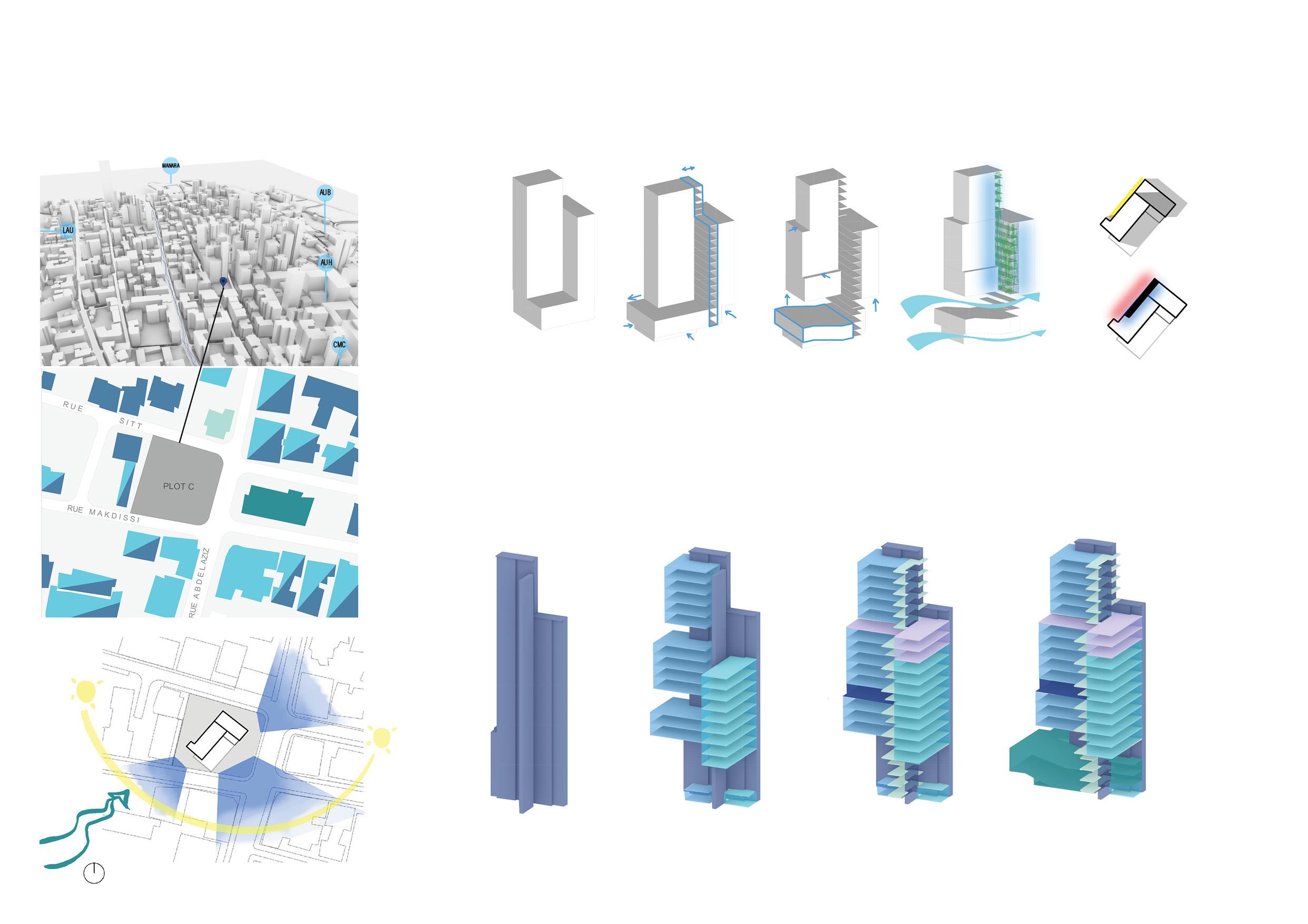 This project accommodates the families of AUB professors in one tower, and students in the other, while enriching the community with a cultural center along with a public park. Located in the proximity of AUB and Hamra Main Street, the cultural center gives its surrounding community access to an art exhibition space, multi-purpose theater, and a rooftop amphitheater. Additionally, the public park is a stepped, highlighting the theatrical essence Hamra once glew with.