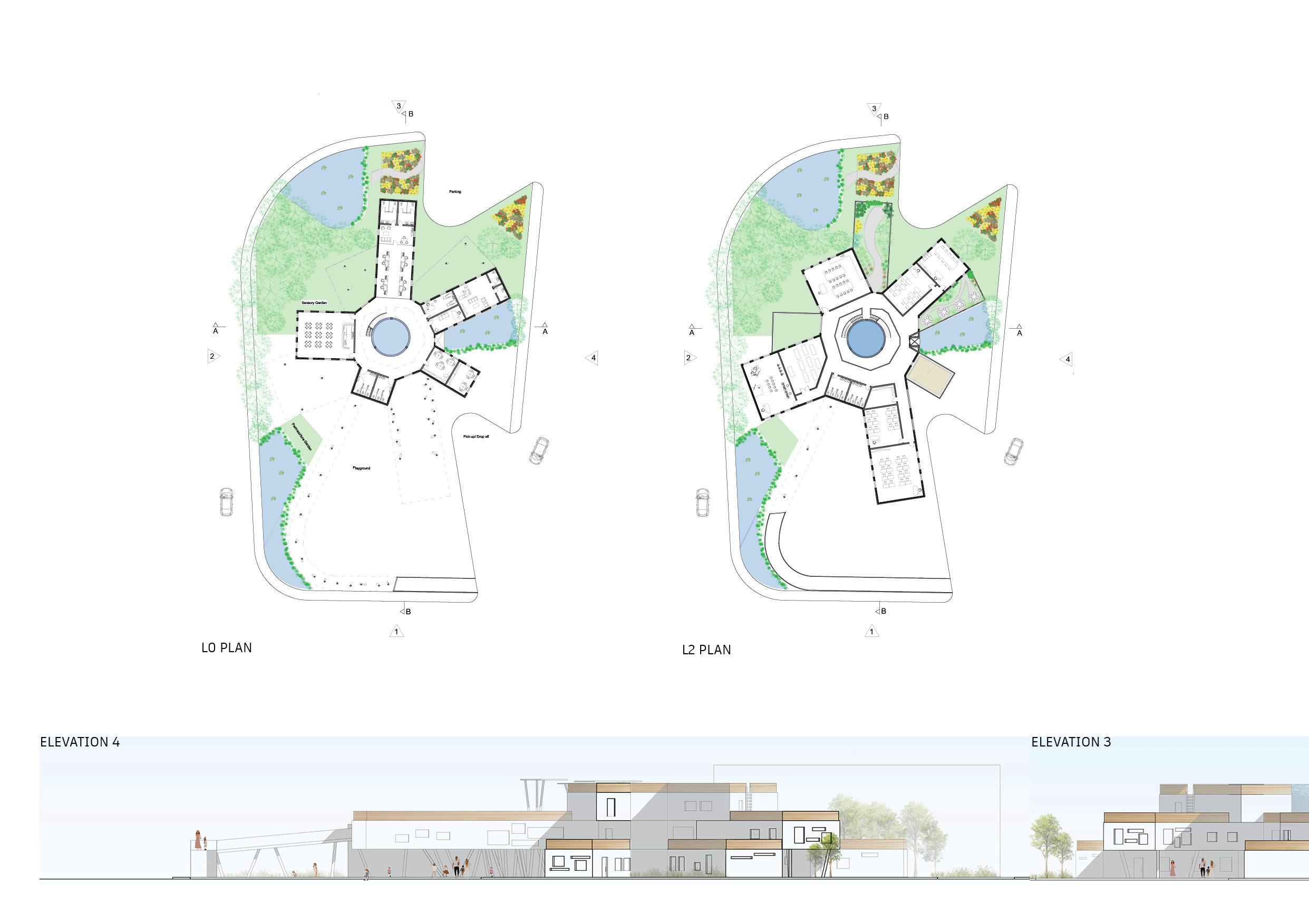 Volumetric overlapping of the building’s floors self shade and create a safe space for students on the playground. The use of shadows creates a subconscious guide to circulation and grounding.