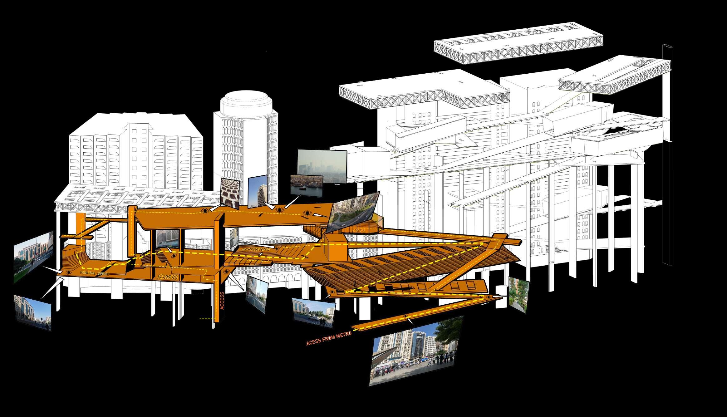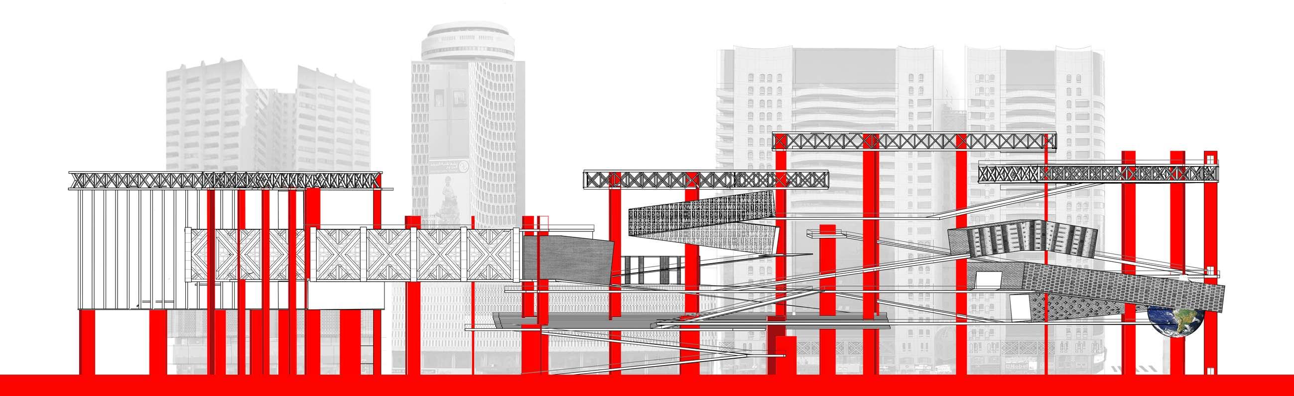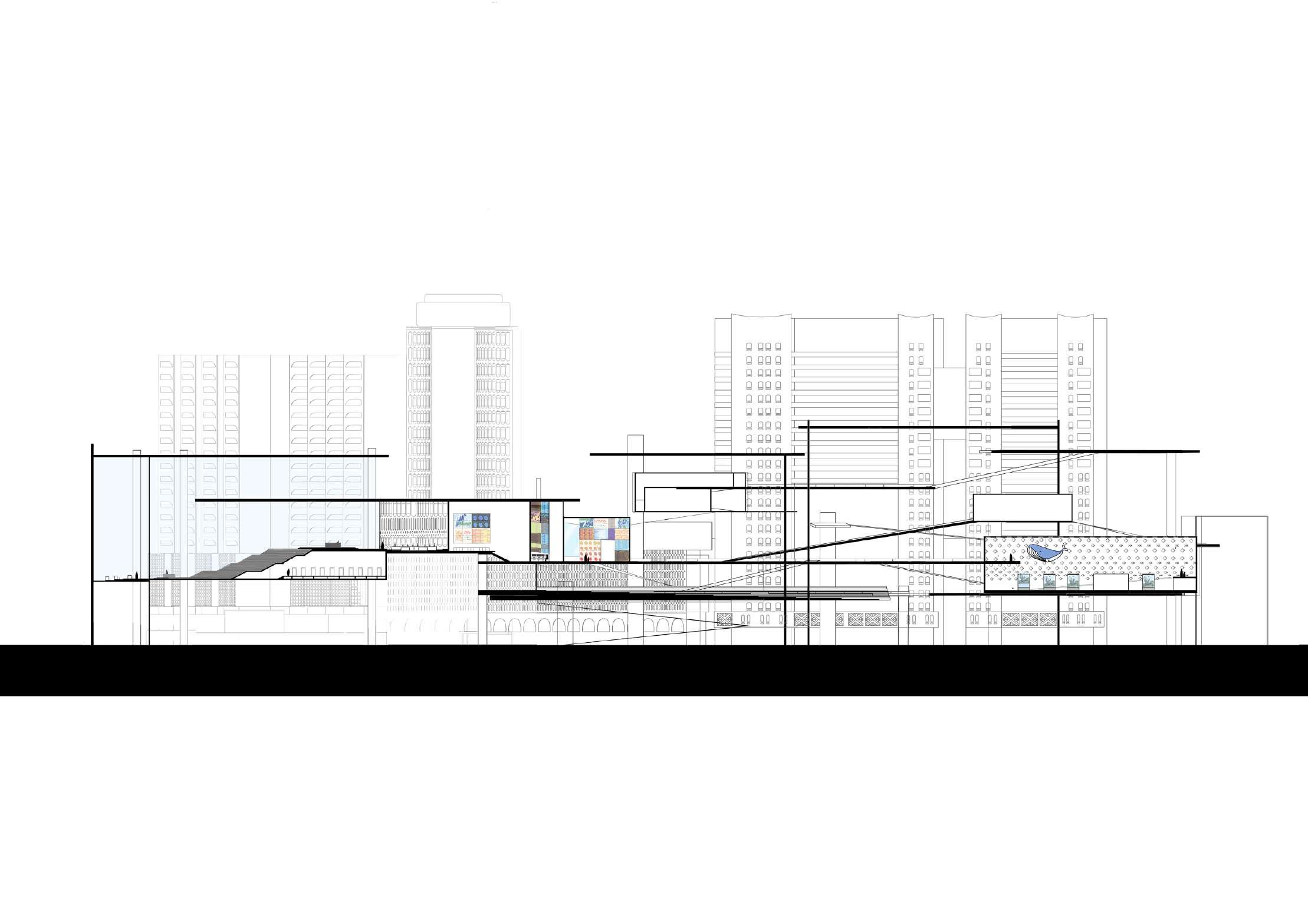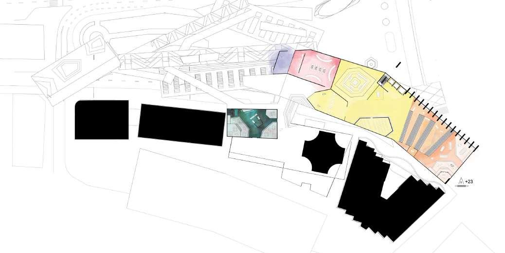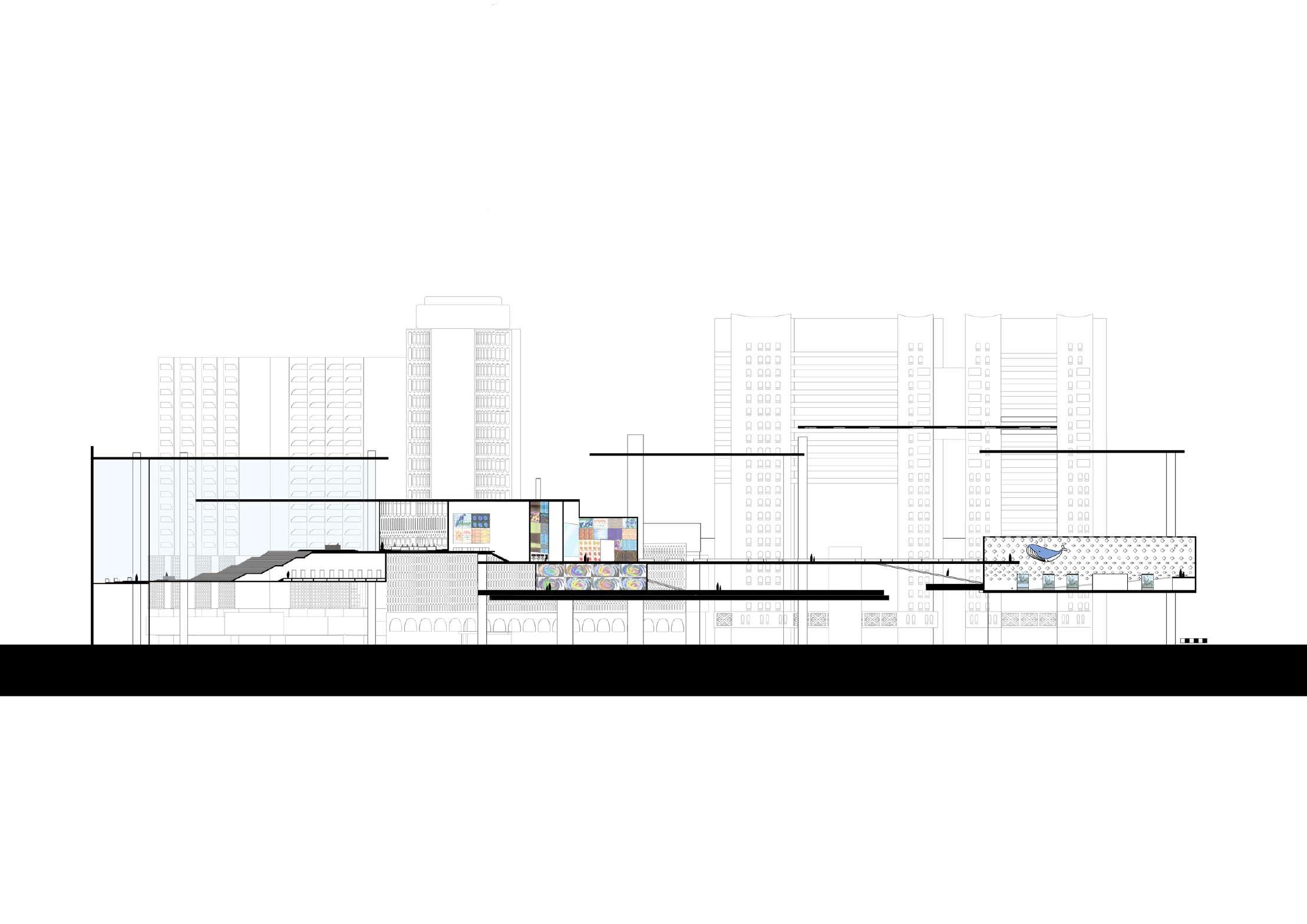 V1-This was the first attempt at a unfolded section ,doing this was helpful as it helped me realize there was a like of dynamicity in the design following a similar linear dialogue mainly aligning to the central plaza space above