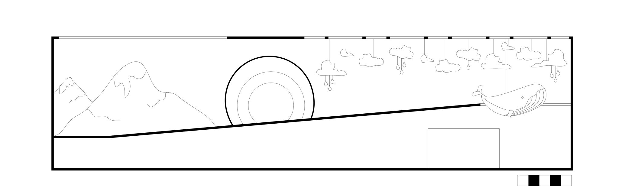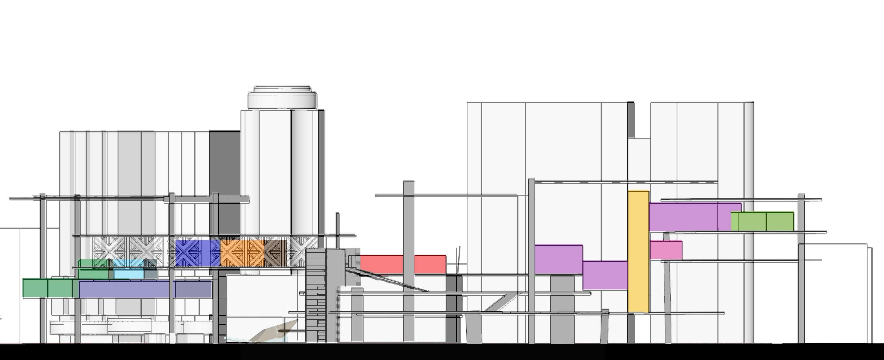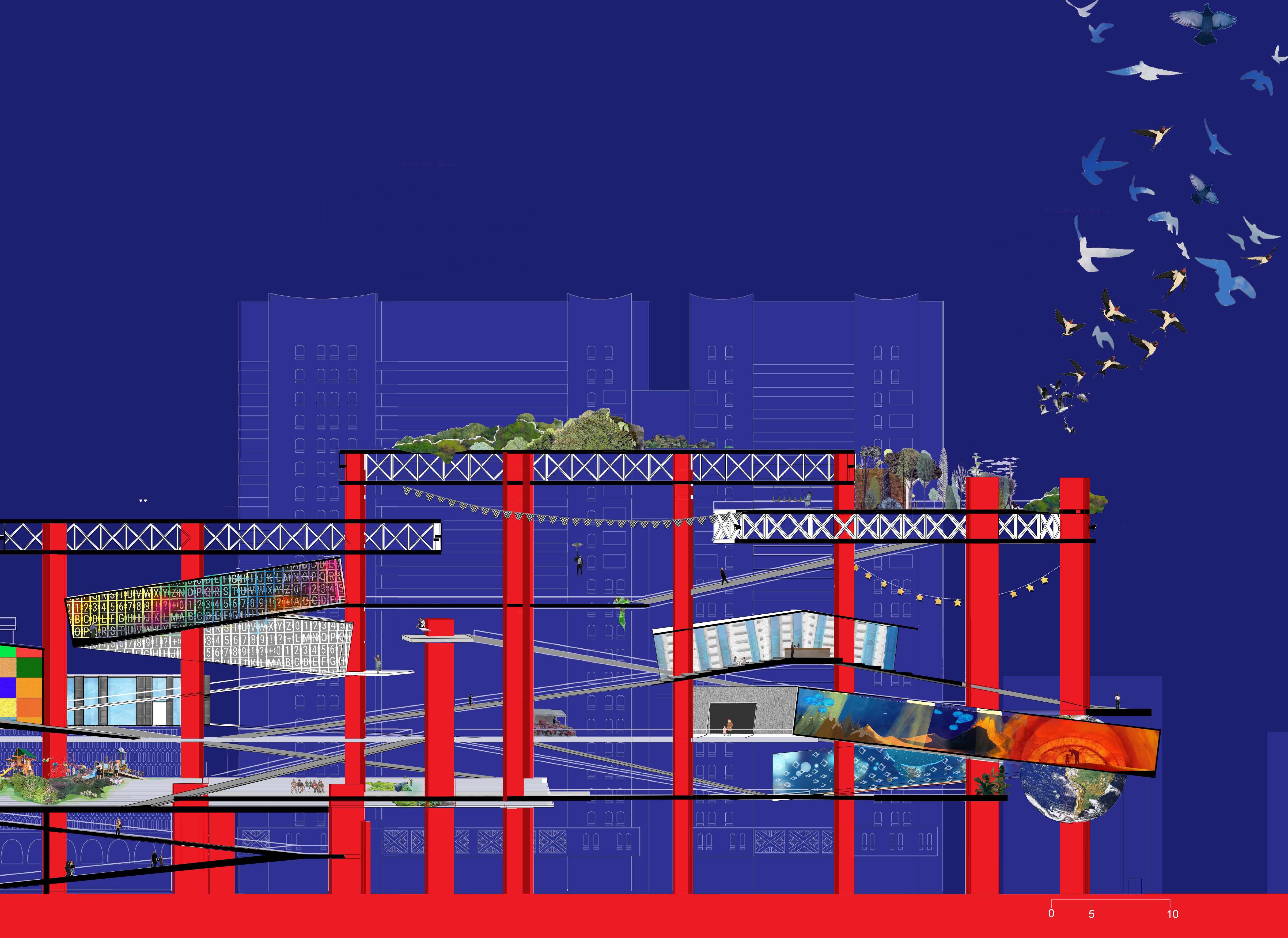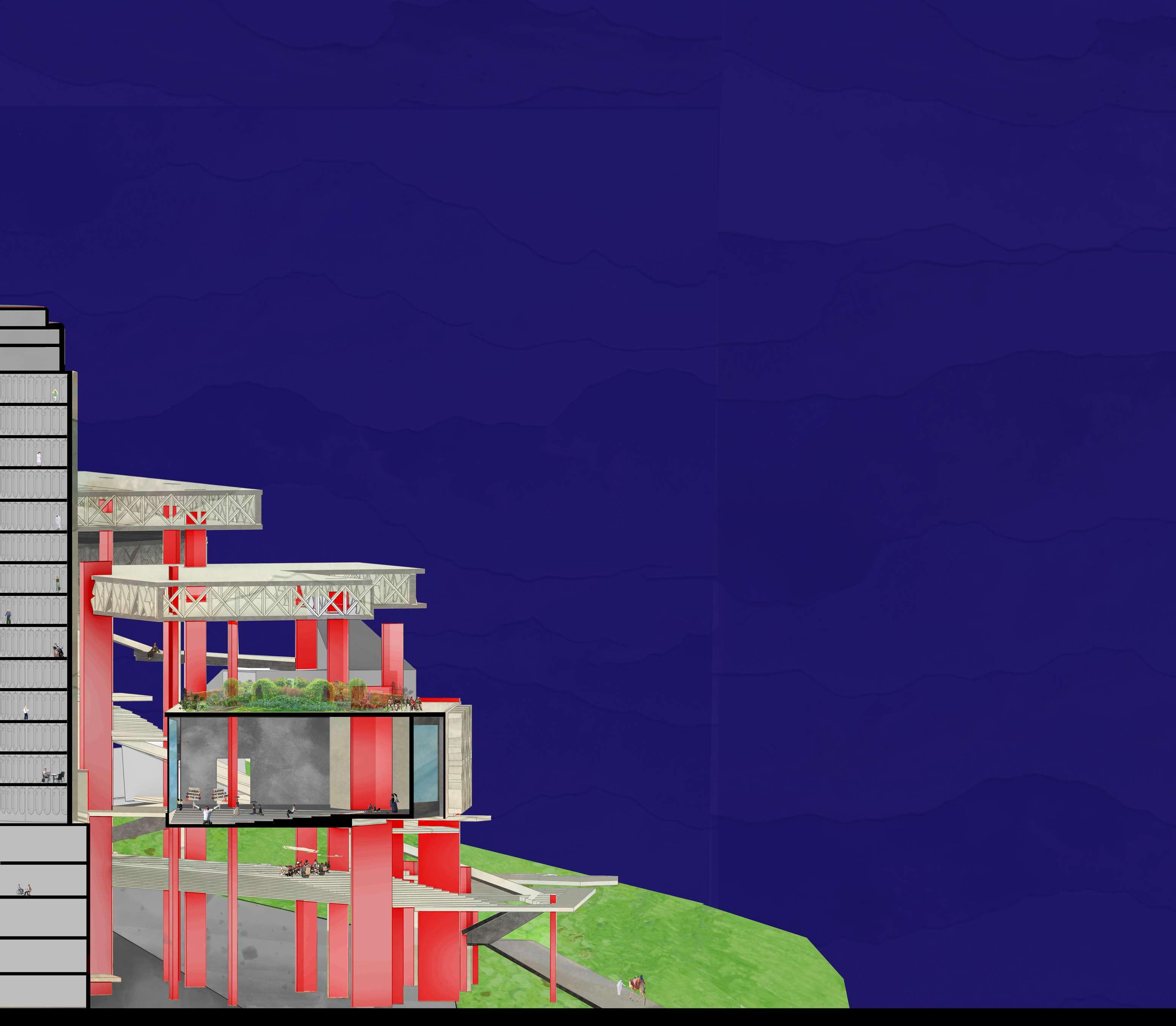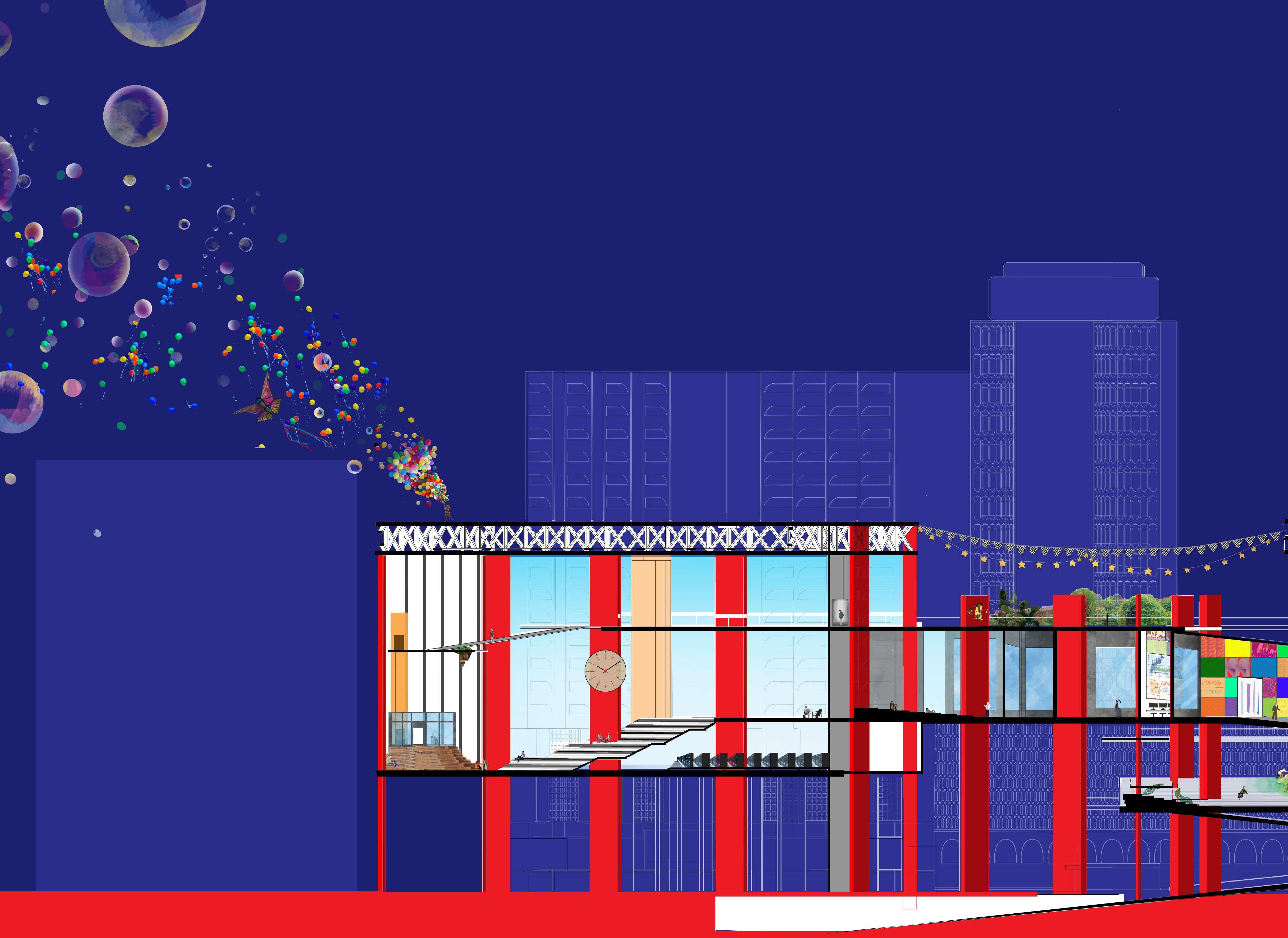 V1-This was the first attempt at a unfolded section ,doing this was helpful as it helped me realize there was a like of dynamicity in the design following a similar linear dialogue mainly aligning to the central plaza space above