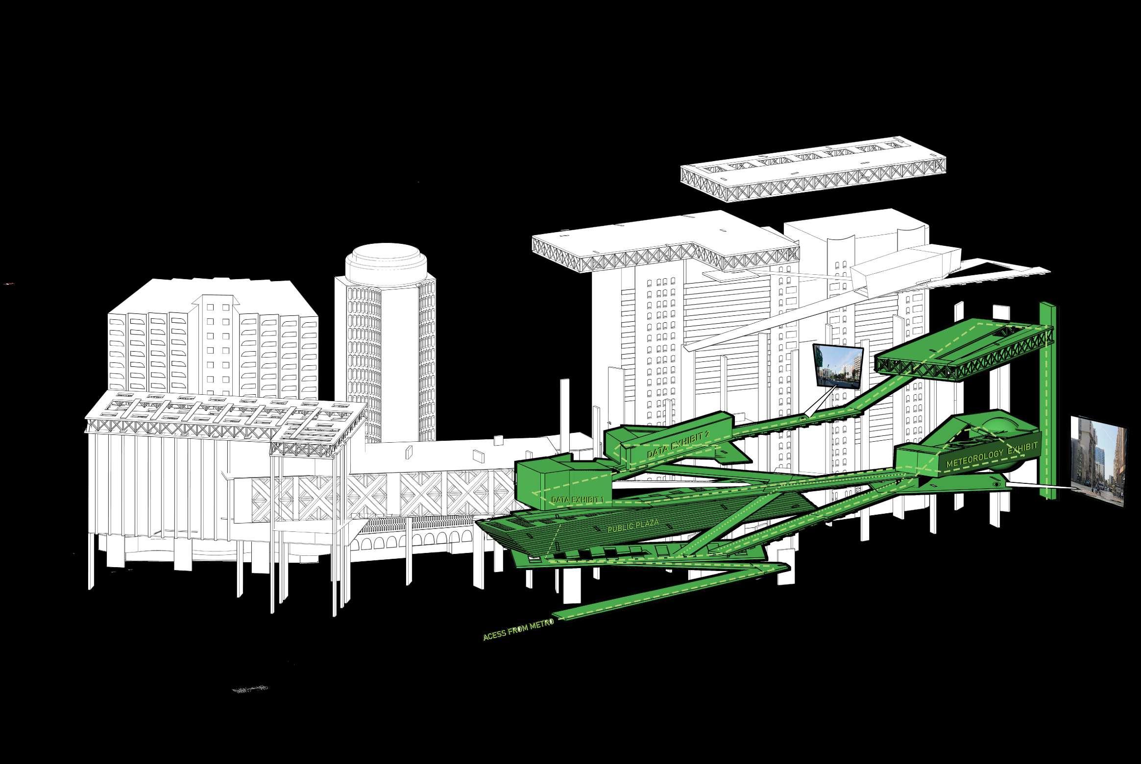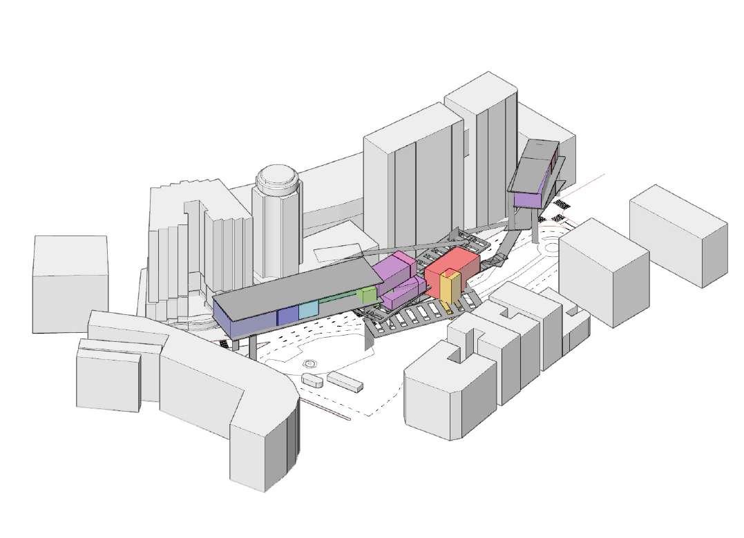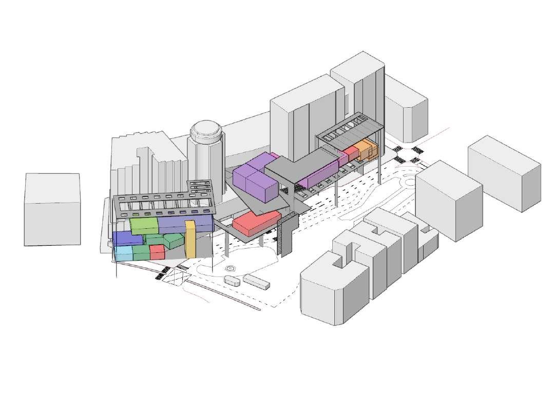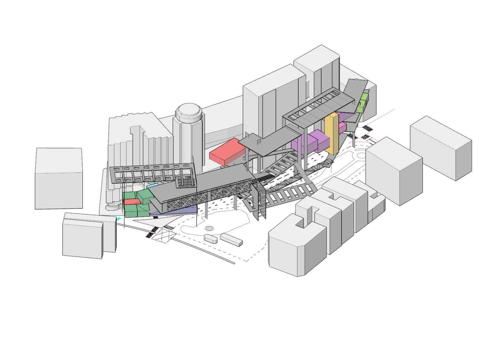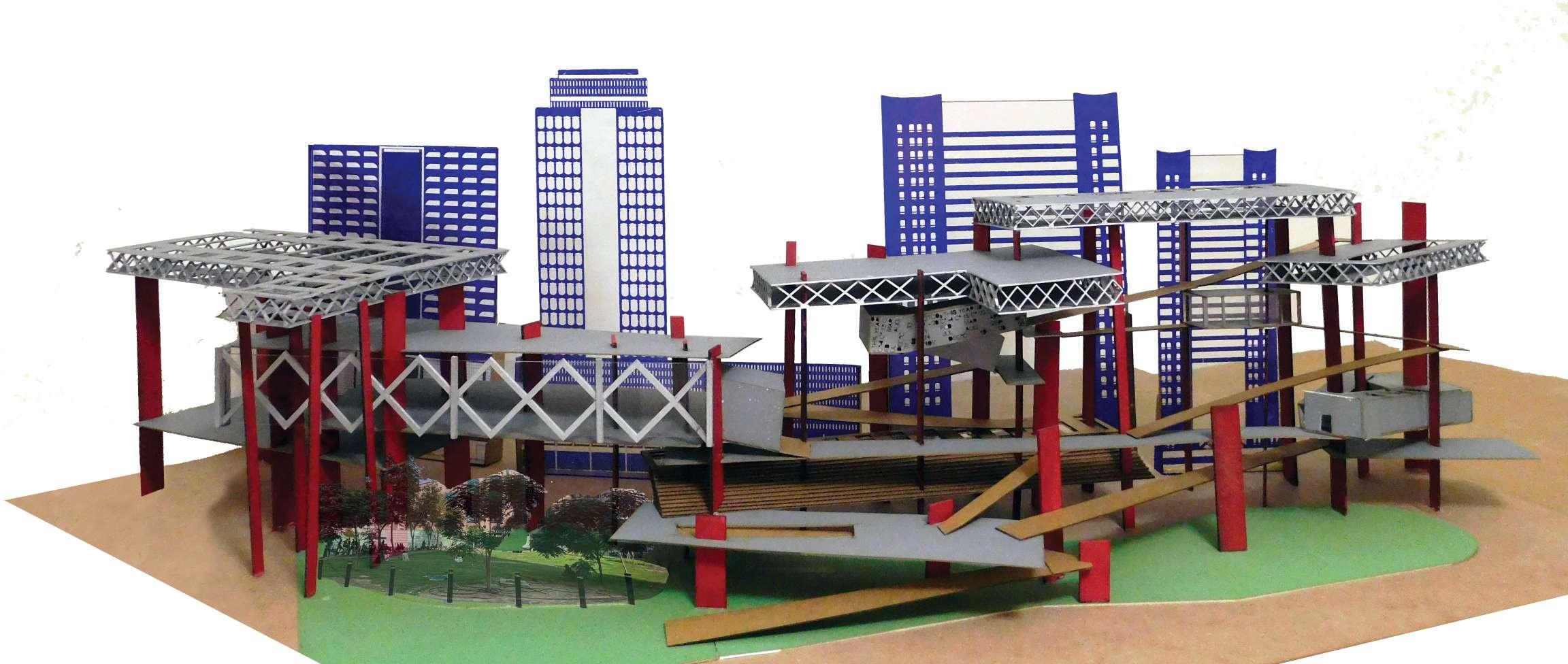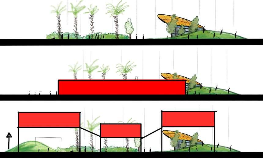 3RD & FINAL ITERATION -Combination of the 2 iterations above as it plays with heights , clashing planes and perforation s that shade the surrounding park