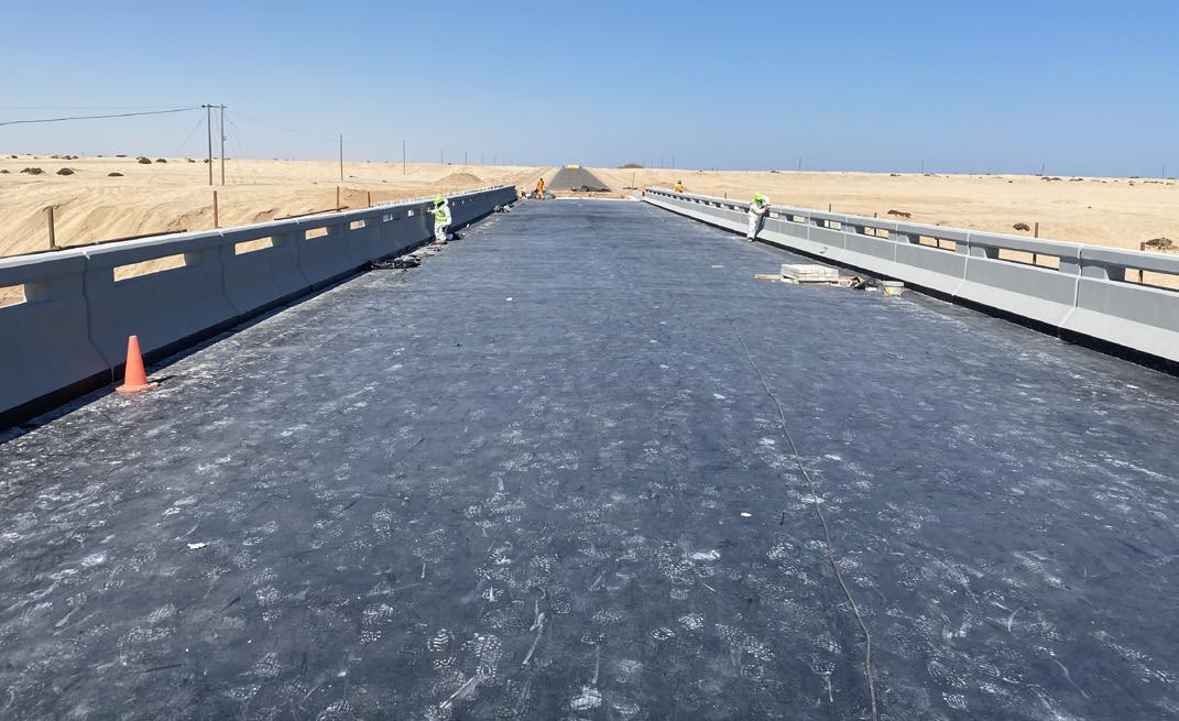 About 480 m² of bridge deck and approach slabs at the Swakopmund site, had SikaBit® Pro P-40 PE applied. It is an APP modified, bituminous, torch-applied, waterproofing membrane. SikaBit® PRO P-40-0 PE is reinforced with a dimensionally stable non-woven polyester inlay. The underside has a thin polyethylene burn-off film for effortless application. It can be applied to wood, metal and concrete substrates including over existing bitumen roofing membranes.