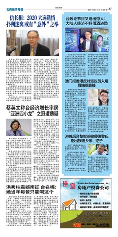 意 呼 唤“ 庶 民 ” 政 治, 前 所 未 有; 二是“九合一”选举未伤“蔡根”, 定 会 挣 扎 反 扑; 三 是 首 次 有 台 北 市 长 组 党, 给 选 情 带 来 震 荡; 四 是 两 岸 关 系 严 峻 复 杂 持 续 未 改, 风 险 增 高; 五 是“ 港 独 ” 暴 力 负 面 影 响 绿 营 趁 机 利 用, 用 心 险 恶; 六 是 特 朗 普上台中美贸易磨擦,起伏不定。 仇长根指出,在这样的背景下, 选情扑朔迷离,变幻莫测。目前国、 民 两 党 初 选 结 束, 各 自 的 困 窘 是, 国民党“卖菜郎”韩国瑜脱颖而出, 但 面 临 党 内 分 裂 之 危, 需 要 整 合; 民 进 党 蔡 英 文 扳 倒 对 手 赢 取 出 线, 但 压 力 重 重, 危 机 四 伏; 无 党 籍 柯 文哲组党,仍在观望盘算,参选未定。 而其它政党及第三势力等各种组合, 不 排 除 有 跌 破 众 人 眼 镜 之 举。 看 今 日 台 湾, 政 党 政 治 发 展 异 化, 想 象 中 任 何 不 可 能 发 生 的 事 情, 都 有 可 能发生。台湾大大小小 11 项选举, 政治人物的手法已经玩得出神入化, 娴熟老道。