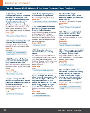 T H U R S DAY S E S S I O N S Thursday Sessions 10:00–11:30 a.m. | Washington Convention Center (continued) #123 | Investing in math development: How early childhood educators can strengthen their instructional approaches through formative assessment to better engage students in learning Milenis Gonzalez, Bank Street College of Education; Davia Brown Franklyn, Bank Street College of Education; Tarima Levine, Bank Street College of Education Room 149AB Preschoolers Assessment of Young Children