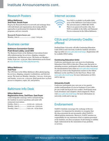Conference participants may earn up to two Continuing Education Units (CEUs) ($20 fee). Please note that prior to attending sessions, participants will need to either download the documentation form online at www.pdx.edu/ceed/naeyc or pick up a form at the Registration counters in the Hilton Baltimore on the 2nd Floor in the East Foyer. Please visit www.pdx.edu/ceed/naeyc for more information on CEUs and to sign up.